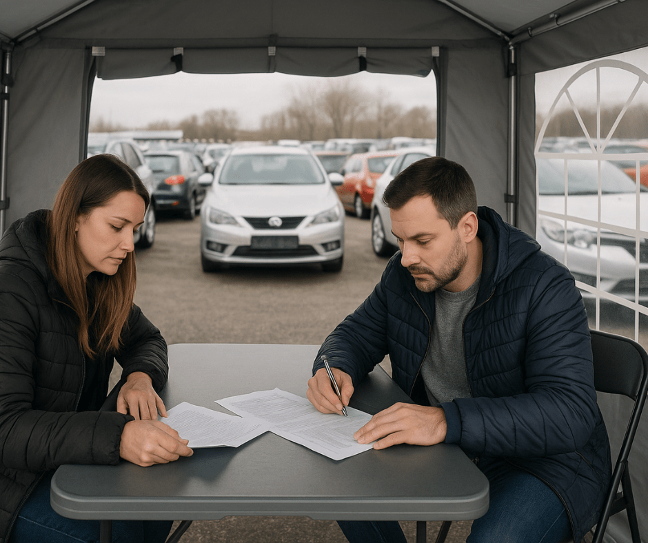 Giełdy samochodowe organizowane są zazwyczaj na otwartych przestrzeniach. Sprzedawcy, chcąc zapewnić swoim klientom suchą i odizolowaną od zgiełku przestrzeń inwestują w namioty handlowe. Takie zadaszenie to doskonałe, mobilne biuro, w którym podpiszemy umowę, przyjmiemy zapłatę za sprzedany pojazd i przygotujemy niezbędne dokumenty.