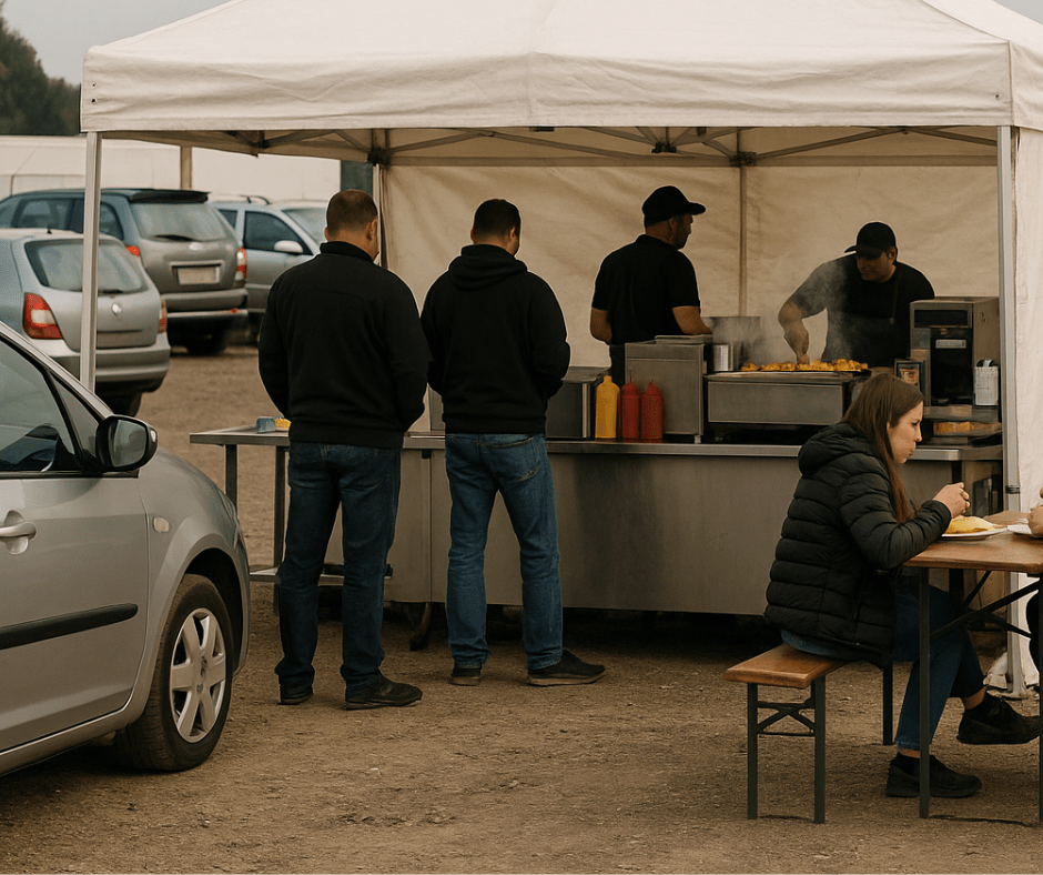 Na giełdach samochodowych kupcy spędzają czasem wiele godzin, zanim zdecydują się na zakup odpowiedniego pojazdu. Nic więc dziwnego, że właściciele mobilnych gastronomii organizują dla nich możliwość zjedzenia ciepłego posiłku. Namioty gastronomiczne doskonale sprawdzają się podczas przygotowywania przekąsek i napoi. Całoroczne zadaszenia zapewniają komfortową strefę do konsumpcji bez względu na pogodę i porę roku.