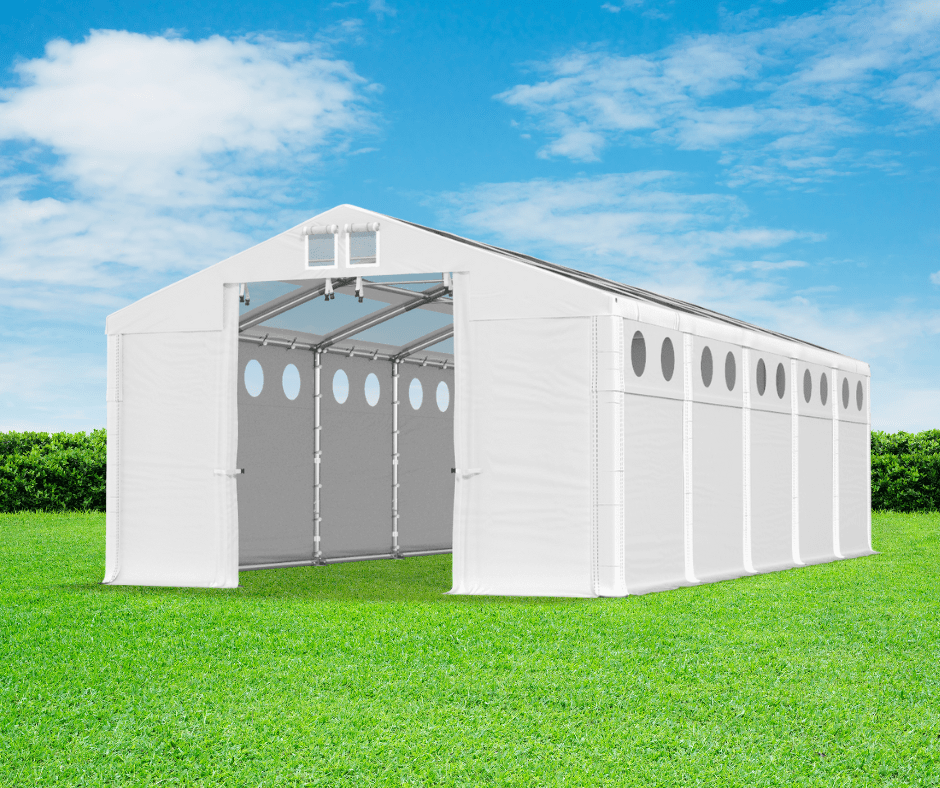 Namioty z oknami doświetlającymi to doskonała alternatywa dla namiotów z pełną plandeką ścian bocznych. Również doskonale maskują wnętrze namiotu, ale jednocześnie zapewniają dopływ dziennego światła. Posiadają bowiem jedynie małe, okrągłe okna umieszczone w górnej części ścian bocznych. W połączeniu z transparentnym dachem tworzą komfortowe zadaszenie do przeprowadzania prac warsztatowych, majsterkowania i magazynowania.
