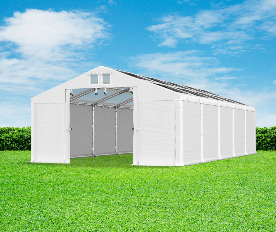 Pełne ściany boczne są niezwykle szczelne i nie przepuszczają światła dziennego. Brak okien uniemożliwia wgląd do namiotu osobom postronnym. Dzięki temu otoczenie namiotu wygląda estetycznie nawet jeśli pod zadaszeniem magazynujemy wiele rzeczy. Transparentny dach wpuszcza dużo dziennego światła i zapewnia komfortowe warunki pracy. Zadaszenia z pełnym poszyciem ścian bocznych najczęściej wykorzystywane są jako namioty magazynowe, namioty handlowe i namioty przemysłowe.