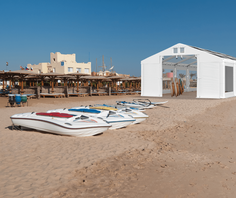 Plandeki namiotów handlowych są wodoodporne i chronią przed promieniowaniem UV. Dzięki temu sprzęt wodny, który przechowywany jest pod zadaszeniem, nie jest narażony na korozję i płowienie. Szczelne poszycia izolują przechowywane w obiekcie przedmioty od wiatru, wilgoci, pyłów i zanieczyszczeń.