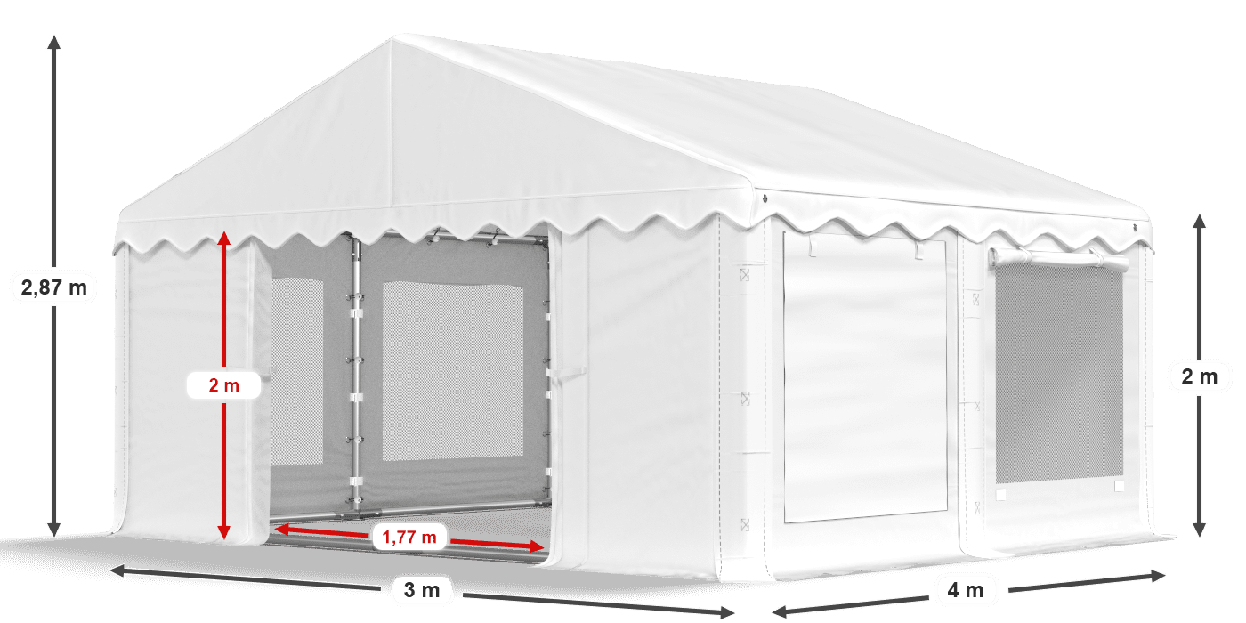 Przewiewna plandeka PE została wyposażona w duże okna z moskitierami. Zadaszenie doskonale sprawdzi się w okresie letnim, ponieważ zapewni przepływ świeżego powietrza, a jednocześnie ochroni stoły i bufety przed latającymi owadami. Okna posiadają rozwijane rolety, którymi możemy uszczelnić moskitiery w razie ochłodzenia. Namiot z moskitierami możemy wykorzystać podczas organizacji imprez plenerowych, rodzinnych pikników i biznesowych przyjęć.