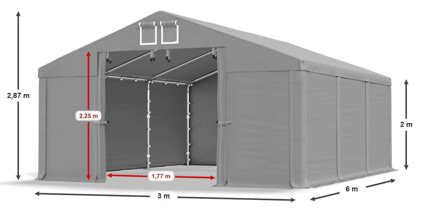 Mocna, pełna plandeka z PVC chroni zawartość namiotu przed zanieczyszczeniami oraz wpływem wilgoci i promieniowania UV. Szczelne poszycie namiotu magazynowego umożliwia przechowywanie towarów, garażowanie pojazdów. Szeroki fartuch retencyjny usprawnia odprowadzanie wody podczas opadów, a podwójne wywietrzniki regulują wymianę powietrza. Plandeka nie posiada okien, co uniemożliwia wgląd do namiotu z zewnątrz.