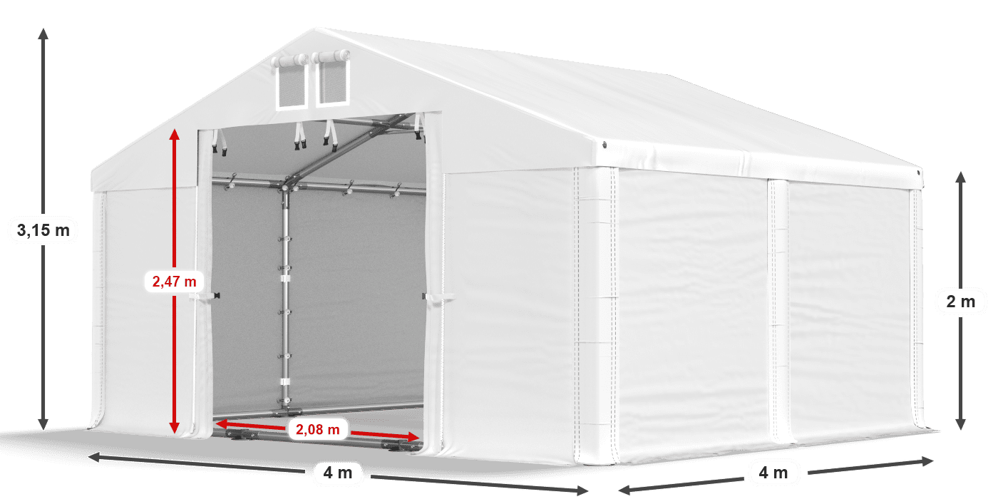 Mocna, pełna plandeka z PVC chroni zawartość namiotu przed zanieczyszczeniami oraz wpływem wilgoci i promieniowania UV. Szczelne poszycie namiotu magazynowego umożliwia przechowywanie towarów, garażowanie pojazdów. Szeroki fartuch retencyjny usprawnia odprowadzanie wody podczas opadów, a podwójne wywietrzniki regulują wymianę powietrza. Plandeka nie posiada okien, co uniemożliwia wgląd do namiotu z zewnątrz.