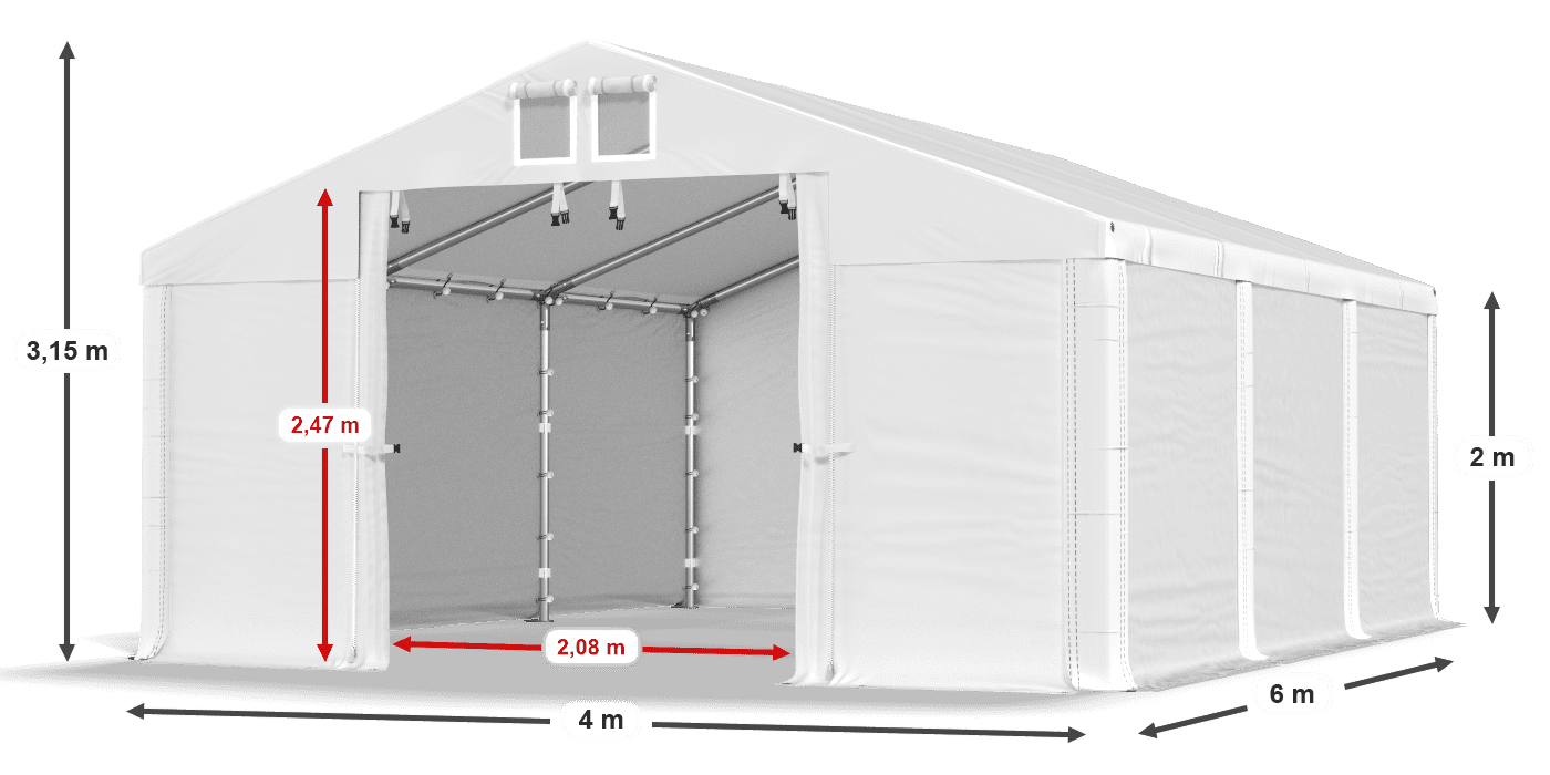 Pełna plandeka wykonana z mocnego i trwałego PVC chroni przechowywane w namiocie magazynowym towary. Poszycie jest wodoodporne, szczelne i odporne na promieniowanie UV. W hali namiotowej możemy magazynować materiały budowlane, surowce, sprzęt sportowy, a nawet pojazdy. Zadaszenie nie posiada okien, dlatego chroni zawartość namiotu garażowego przed wzrokiem osób postronnych. Plandeka posiada system szybkiej zmiany długości Multi-size.