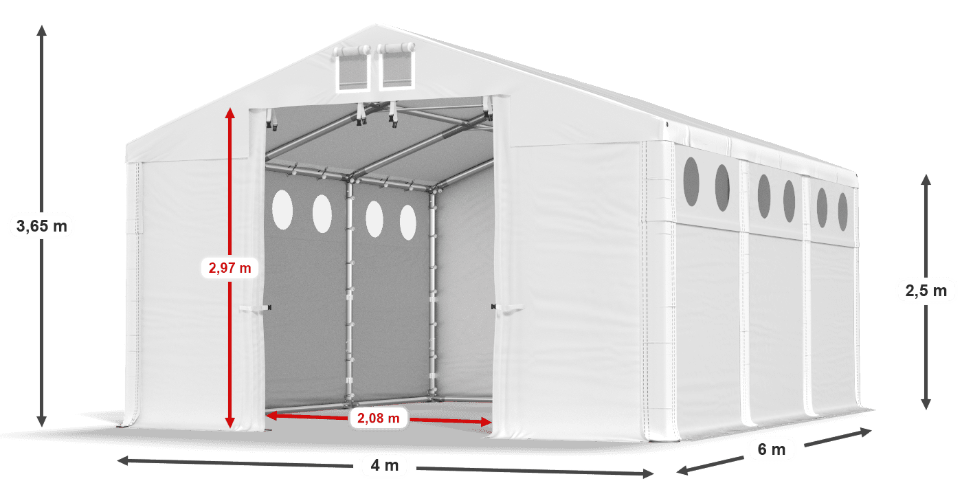 Mocne poszycie z oknami doświetlającymi umożliwia garażowanie pojazdów, magazynowanie towarów i wykonywanie prac związanych z montażem. Trudnopalna plandeka wykonana z PVC jest wodoodporna, szczelna i odporna na promieniowanie UV. W suchym i zacienionym namiocie magazynowym możemy przechowywać plony, materiały budowlane i surowce. Okrągłe okna doświetlające zapewniają naturalne światło. Plandeka posiada system szybkiej zmiany długości Multi-size.