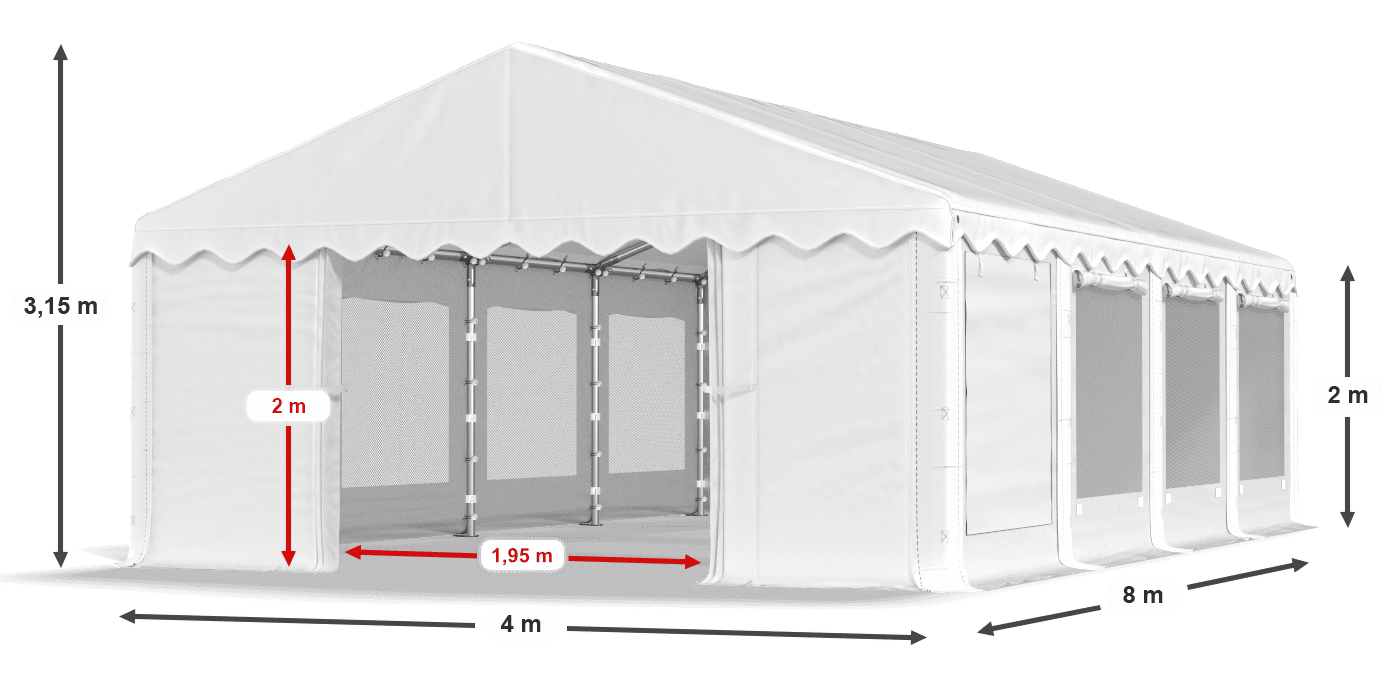 Przewiewna plandeka PE została wyposażona w duże okna z moskitierami. Zadaszenie doskonale sprawdzi się w okresie letnim, ponieważ zapewni przepływ świeżego powietrza, a jednocześnie ochroni stoły i bufety przed latającymi owadami. Okna posiadają rozwijane rolety, którymi możemy uszczelnić moskitiery w razie ochłodzenia. Namiot z moskitierami możemy wykorzystać podczas organizacji imprez plenerowych, rodzinnych pikników i biznesowych przyjęć.