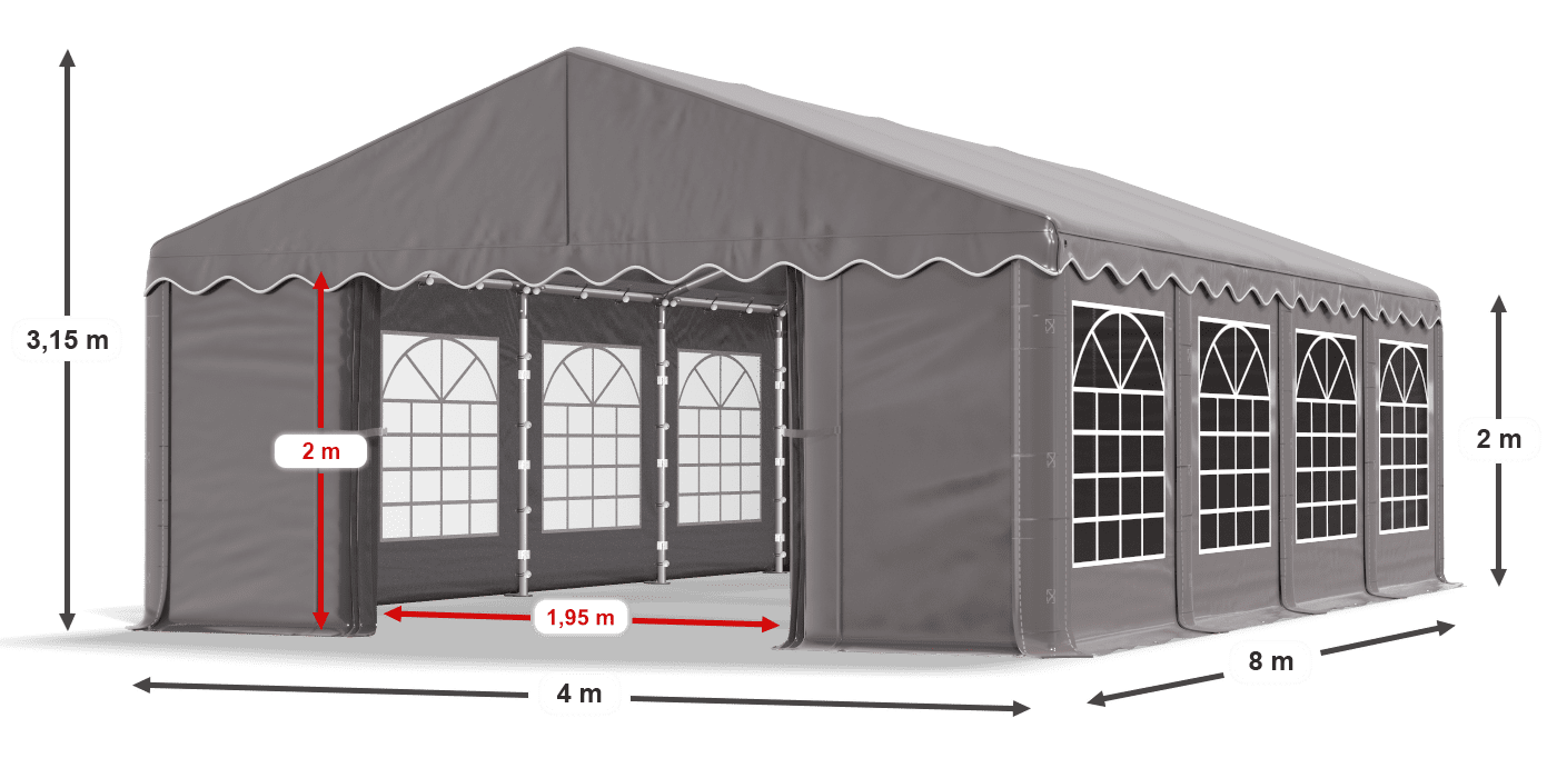 Ściana boczna zbudowana jest z grubej plandeki PE ok. 240g/m2 oraz dużych okien witrażowych. Wysokość podstawowej ścianki to 2m. Dzięki oknom umieszczonym na każdym dwumetrowym segmencie, namiot wygląda estetycznie. Nadaje się on świetnie jako namiot handlowy, wystawowy lub imprezowy.