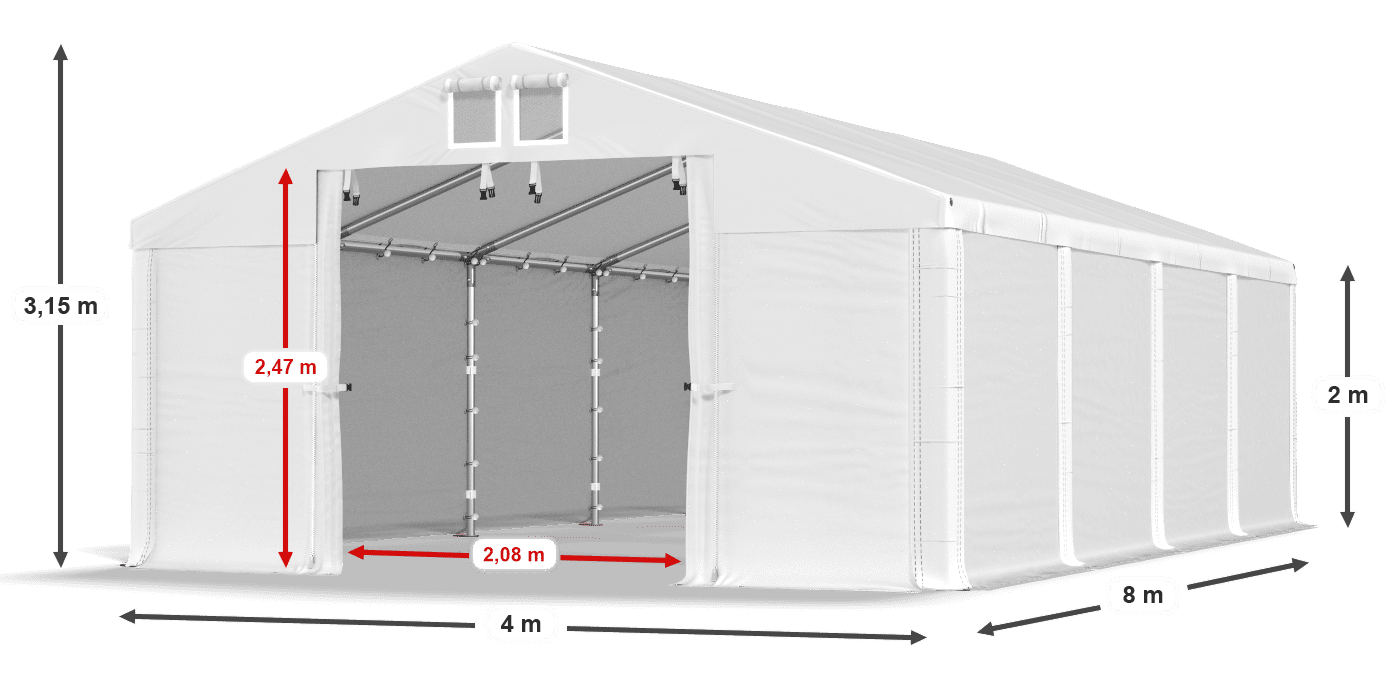 Mocna, pełna plandeka z PVC chroni zawartość namiotu przed zanieczyszczeniami oraz wpływem wilgoci i promieniowania UV. Szczelne poszycie namiotu magazynowego umożliwia przechowywanie towarów, garażowanie pojazdów. Szeroki fartuch retencyjny usprawnia odprowadzanie wody podczas opadów, a podwójne wywietrzniki regulują wymianę powietrza. Plandeka nie posiada okien, co uniemożliwia wgląd do namiotu z zewnątrz.