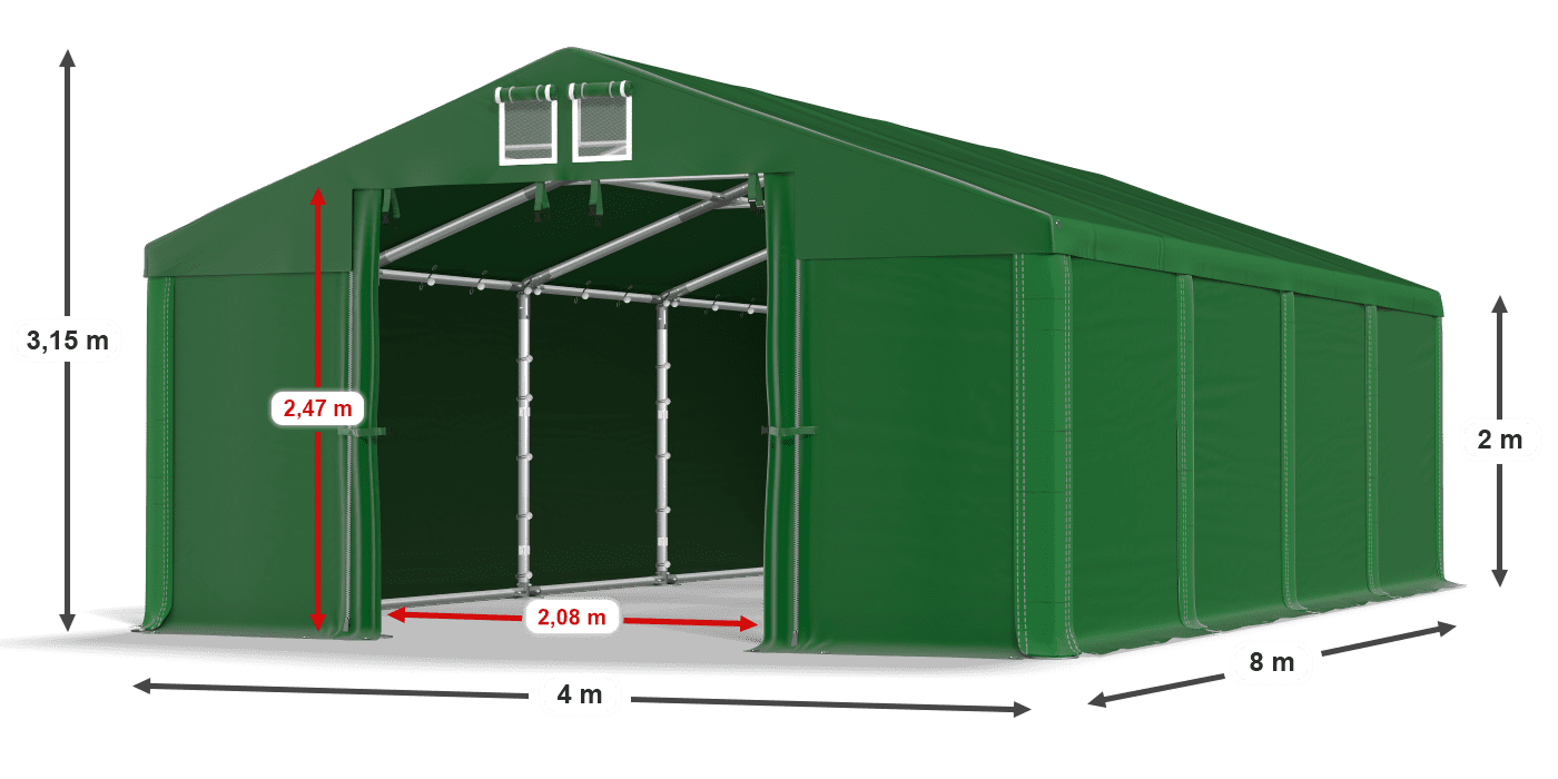 Mocna, pełna plandeka z PVC chroni zawartość namiotu przed zanieczyszczeniami oraz wpływem wilgoci i promieniowania UV. Szczelne poszycie namiotu magazynowego umożliwia przechowywanie towarów, garażowanie pojazdów. Szeroki fartuch retencyjny usprawnia odprowadzanie wody podczas opadów, a podwójne wywietrzniki regulują wymianę powietrza. Plandeka nie posiada okien, co uniemożliwia wgląd do namiotu z zewnątrz.