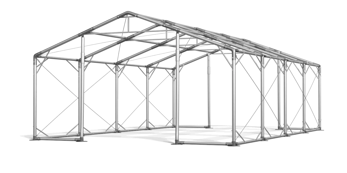 Pełna, szara plandeka wykonana z PVC o wysokiej gramaturze doskonale izoluje przechowywane pod zadaszeniem towary i pojazdy od czynników atmosferycznych. Mocna, całoroczna plandeka została wyposażona w dodatkowe mniejsze wejście, które znajduje się obok dużej bramy wjazdowej. To doskonały namiot magazynowy i solidny namiot garażowy. Wodoodporne i trudnopalne poszycie umożliwia przeprowadzanie prac warsztatowych i produkcyjnych w hali namiotowej.