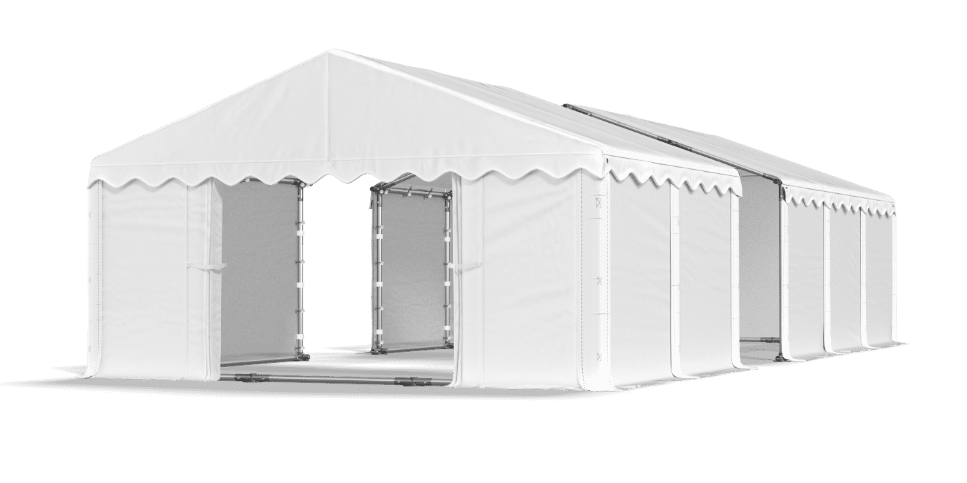 Zadaszenia wyposażone w pełną plandekę z PE to doskonałe, sezonowe namioty magazynowe. Wodoodporne i odporne na promieniowanie UV poszycie nie posiada okien. Dlatego zawartość namiotu garażowego jest niewidoczna z zewnątrz dla osób postronnych. Zadaszenie można wykorzystać również do okresowego garażowania pojazdu, przechowywania mebli i narzędzi ogrodowych lub jako przestrzeń handlową.