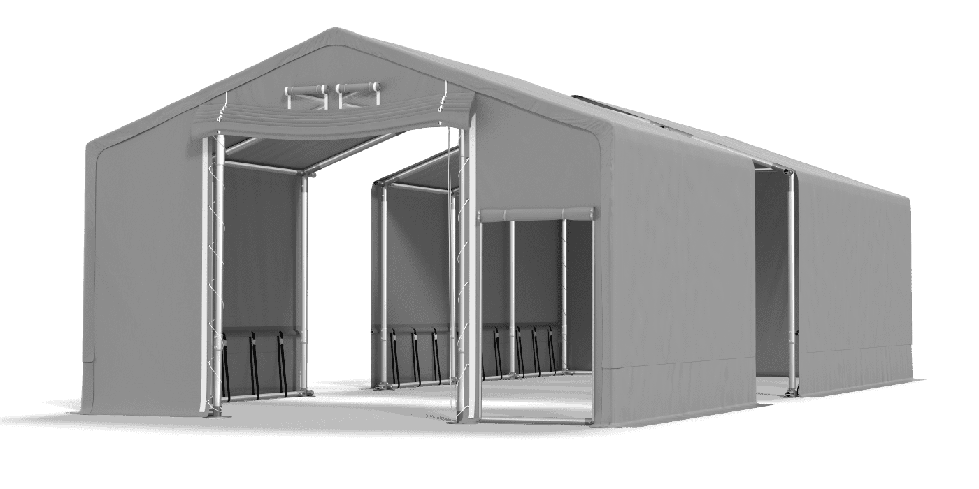 Pełna, szara plandeka wykonana z PVC o wysokiej gramaturze doskonale izoluje przechowywane pod zadaszeniem towary i pojazdy od czynników atmosferycznych. Mocna, całoroczna plandeka została wyposażona w dodatkowe mniejsze wejście, które znajduje się obok dużej bramy wjazdowej. To doskonały namiot magazynowy i solidny namiot garażowy. Wodoodporne i trudnopalne poszycie umożliwia przeprowadzanie prac warsztatowych i produkcyjnych w hali namiotowej.