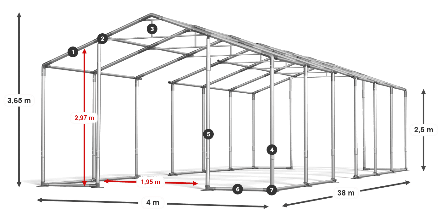 Wysokości w namiotach magazynowych oraz imprezowych mogą być szybko zmienione, a to dzięki modułowej konstrukcji, która pozwala na podniesienie namiotu o 0,5m lub o 1m. Najniższa możliwa wysokość ściany bocznej to 2m, a najwyższa to 4m.