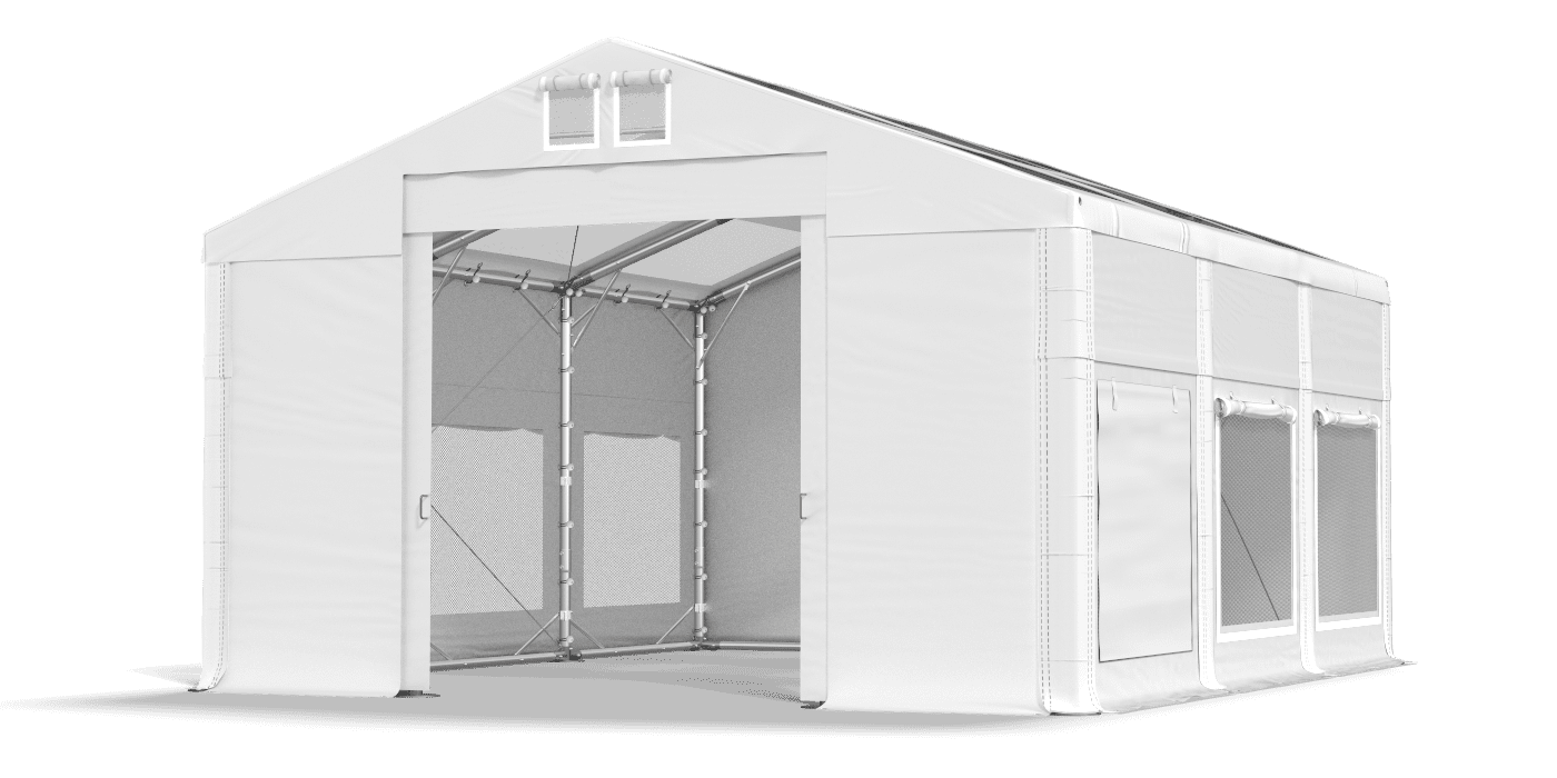 Każda ze ścian jest wyposażona we wbudowaną siatkę przepuszczającą powietrze. Nad każdym z takich siateczkowych okien znajduje się roleta, która na całej długości posiada rzepy. Rzepy te, po rozwinięciu rolety idealnie przylegają do ścianki, tworząc zamkniętą całość. Dlatego namioty z takimi ściankami można wykorzystywać w dwojaki sposób - i jako namioty imprezowe czy ogrodowe, ustawiając w środku stoliki i krzesła, i jako składziki do magazynowania. Dodatkowo w dachu znajdują się bardzo duże, całkowicie przezroczyste okna, dzięki czemu światło słoneczne w pełni doświetla namiot.