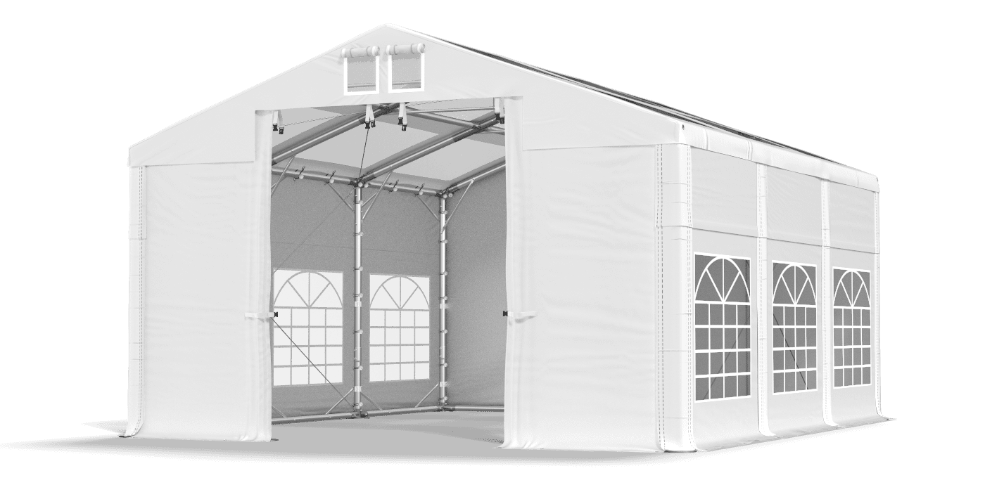 Plandeka wyposażona w witrażowe okna i transparentny dach zapewnia optymalne doświetlenie stołów i bufetów podczas przyjęć w namiocie imprezowym. Mocne poszycie z PVC chroni przed wilgocią, wiatrem i promieniowanie UV. W namiocie eventowym można zorganizować rodzinne uroczystości, firmowe bankiety, festyny i wystawy. To także znakomity namiot ogrodowy i namiot handlowy. Poszycie zostało wyposażone w system łatwej zmiany długości Multi-size.