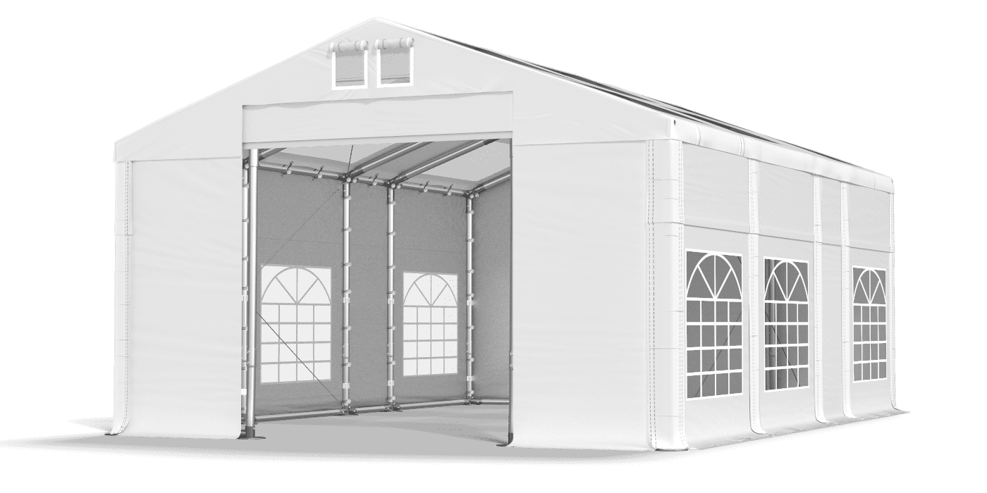 Plandeka wyposażona w witrażowe okna i transparentny dach zapewnia optymalne doświetlenie stołów i bufetów podczas przyjęć w namiocie imprezowym. Mocne poszycie z PVC chroni przed wilgocią, wiatrem i promieniowanie UV. W namiocie eventowym można zorganizować rodzinne uroczystości, firmowe bankiety, festyny i wystawy. To także znakomity namiot ogrodowy i namiot handlowy. Poszycie zostało wyposażone w system łatwej zmiany długości Multi-size.
