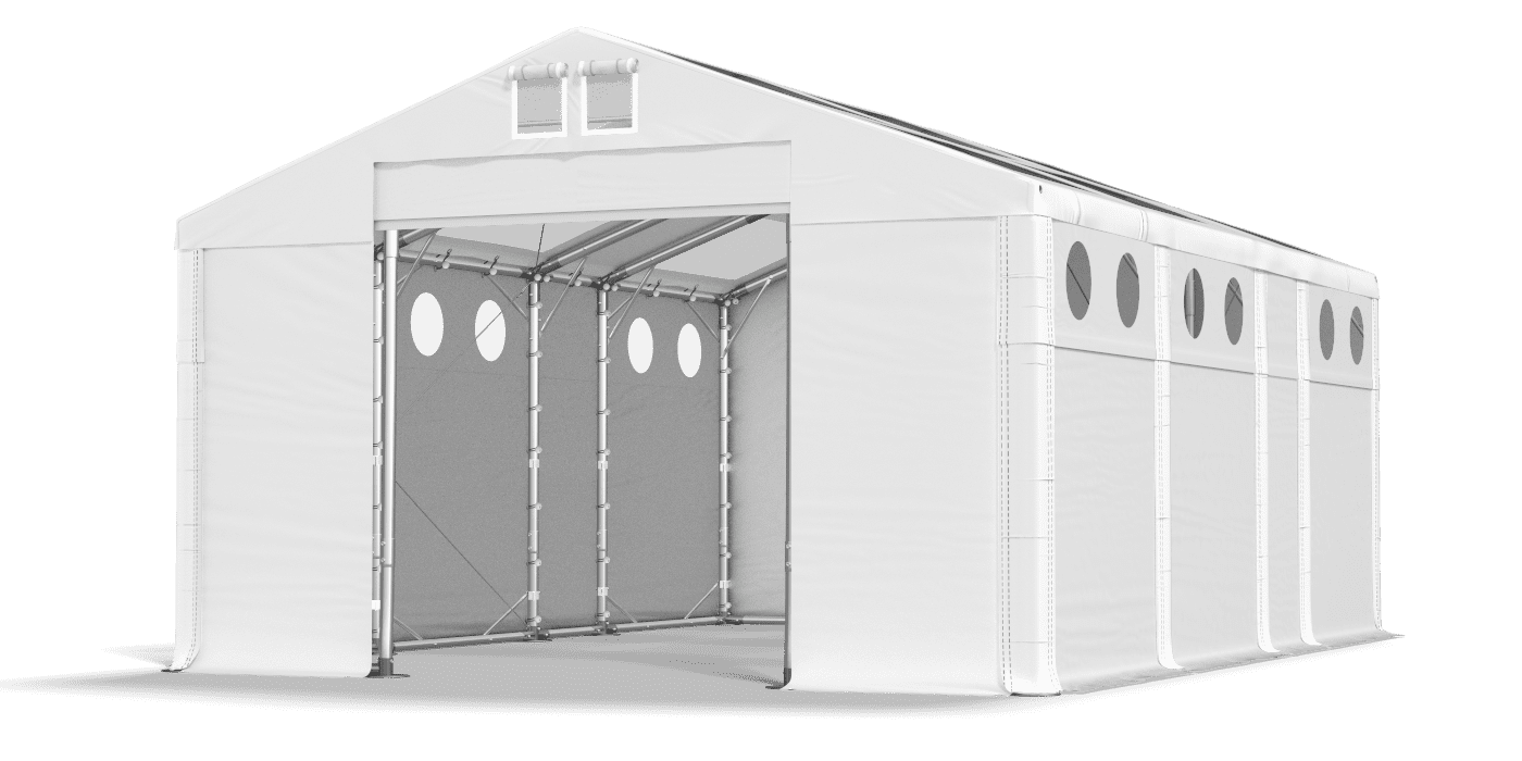 Plandeka wyposażona jest w małe okna doświetlające oraz transparentny dach. Dzięki temu wnętrze namiotu magazynowego jest dobrze doświetlone, a jednocześnie niewidoczne dla osób z zewnątrz. Poszycie wykonane jest z trwałego PVC, odpornego na wilgoć i promieniowanie UV. Szczelny namiot garażowy umożliwia przechowywanie towarów handlowych, sprzętu sportowego i pojazdów. Pod zadaszeniem można przeprowadzać prace związane z montażem, produkcją i segregacją. Poszycie zostało wyposażone w system łatwej zmiany długości Multi-size.