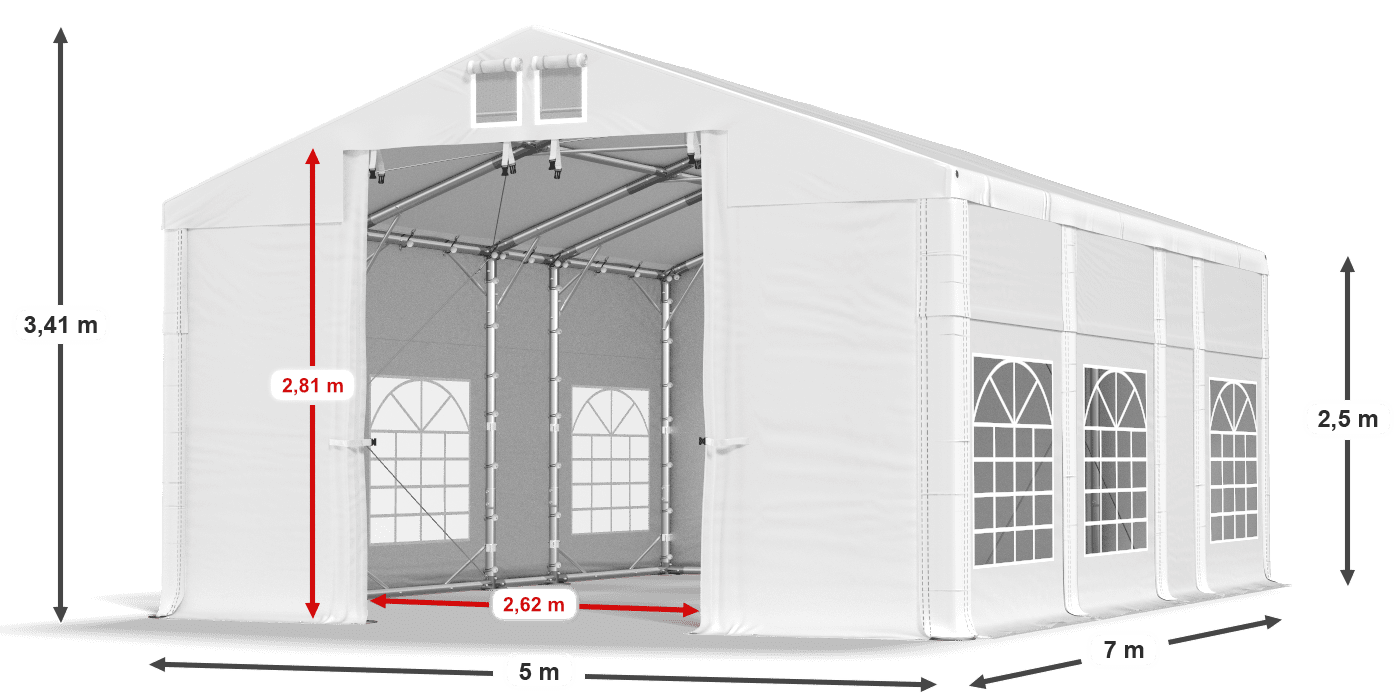 Wysokości w namiotach magazynowych oraz imprezowych mogą być szybko zmienione, a to dzięki modułowej konstrukcji, która pozwala na podniesienie namiotu o 0,5m lub o 1m. Najniższa możliwa wysokość ściany bocznej to 2m, a najwyższa to 4m.