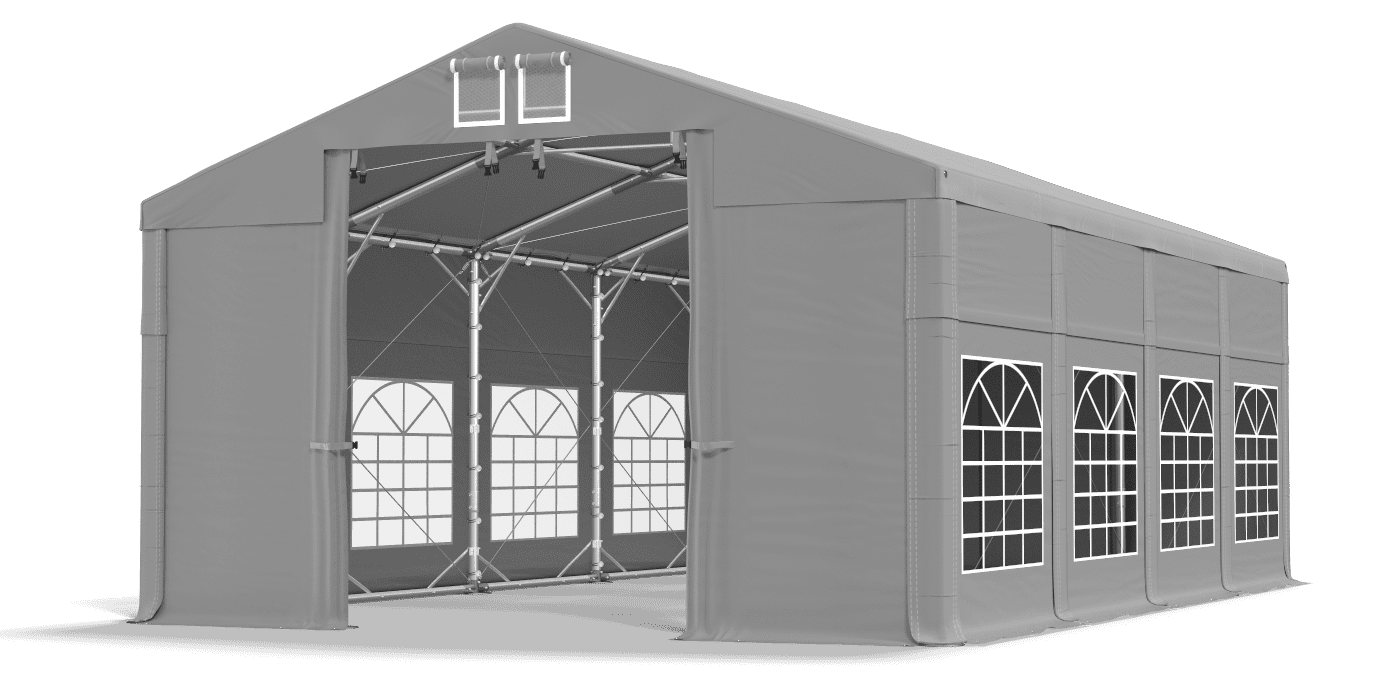 Mocne poszycie z oknami witrażowymi chroni stoły i bufety przed wilgocią i wiatrem. Szczelna plandeka z PVC jest odporna na promieniowanie UV, dlatego zapewnia suchą i zacienioną przestrzeń. W namiocie imprezowym możemy zorganizować rodzinne przyjęcia, festyny gminne i bankiety firmowe. To także doskonały namiot ogrodowy i namiot handlowy. Elegancka plandeka została wyposażona w system łatwej zmiany długości Multi-size.