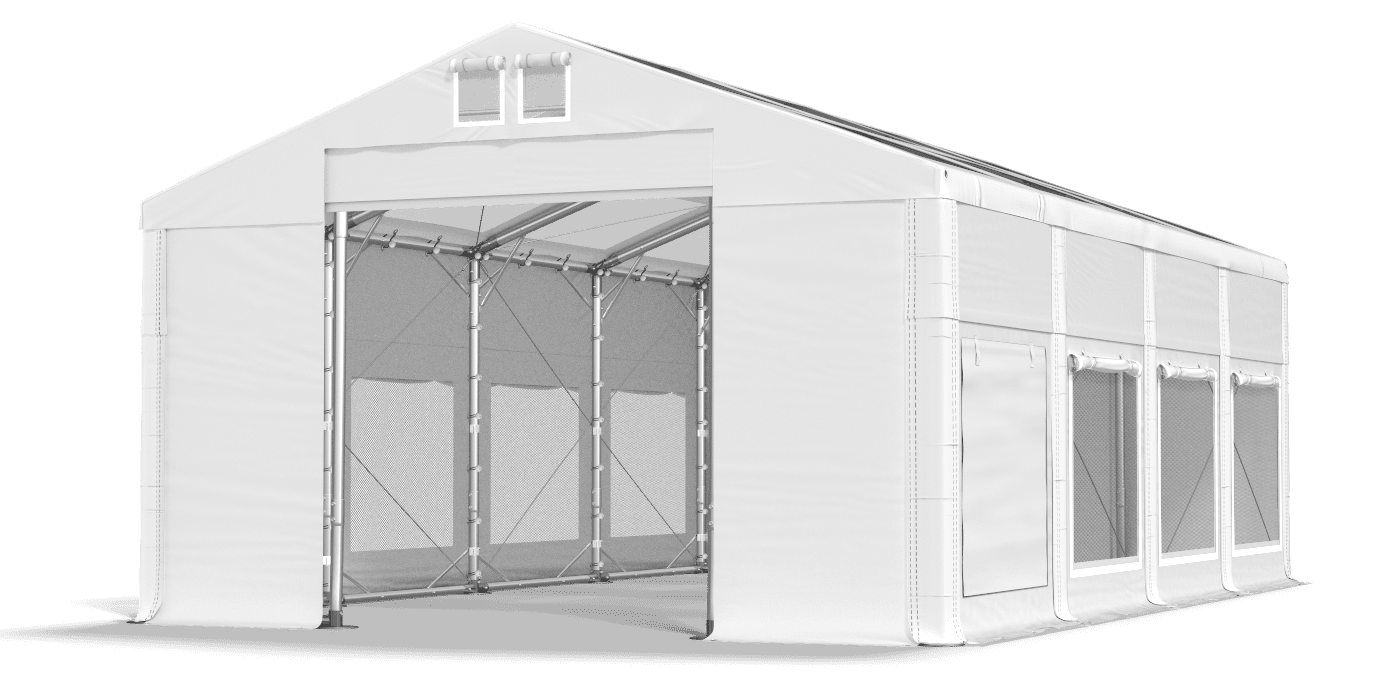 Każda ze ścian jest wyposażona we wbudowaną siatkę przepuszczającą powietrze. Nad każdym z takich siateczkowych okien znajduje się roleta, która na całej długości posiada rzepy. Rzepy te, po rozwinięciu rolety idealnie przylegają do ścianki, tworząc zamkniętą całość. Dlatego namioty z takimi ściankami można wykorzystywać w dwojaki sposób - i jako namioty imprezowe czy ogrodowe, ustawiając w środku stoliki i krzesła, i jako składziki do magazynowania. Dodatkowo w dachu znajdują się bardzo duże, całkowicie przezroczyste okna, dzięki czemu światło słoneczne w pełni doświetla namiot.