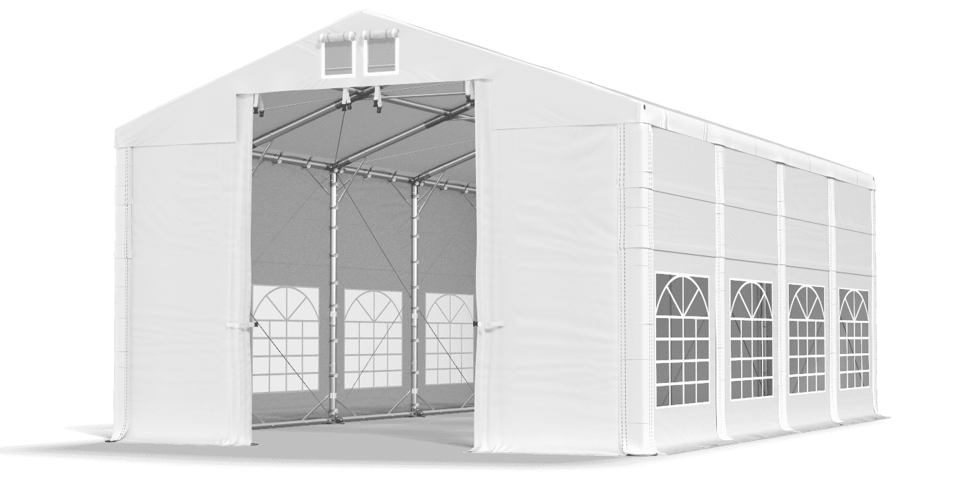 Mocne poszycie z oknami witrażowymi chroni stoły i bufety przed wilgocią i wiatrem. Szczelna plandeka z PVC jest odporna na promieniowanie UV, dlatego zapewnia suchą i zacienioną przestrzeń. W namiocie imprezowym możemy zorganizować rodzinne przyjęcia, festyny gminne i bankiety firmowe. To także doskonały namiot ogrodowy i namiot handlowy. Elegancka plandeka została wyposażona w system łatwej zmiany długości Multi-size.