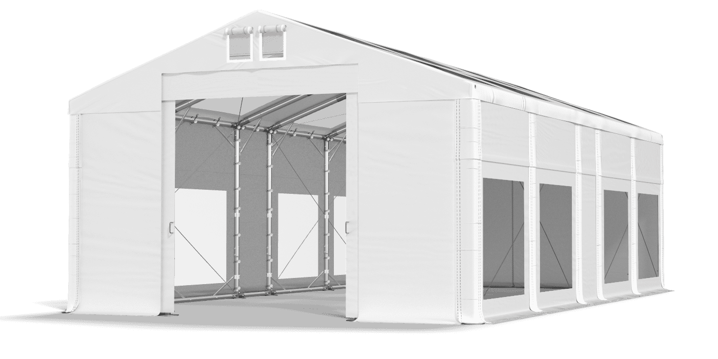Poszycie wyposażone jest w transparentne boki i dach. Dzięki temu gwarantuje pełne doświetlenie namiotu eventowego. Zadaszenie może być używane w handlu, ponieważ umożliwia estetyczne wyeksponowanie towarów. Plandeka wykonana jest z PVC o wysokiej gramaturze. Dzięki temu chroni stoły i bufety przed wiatrem, wilgocią i zanieczyszczeniami z zewnątrz. To doskonały namiot ogrodowy i namiot wystawowy. Poszycie zostało wyposażone w system łatwej zmiany długości Multi-size.