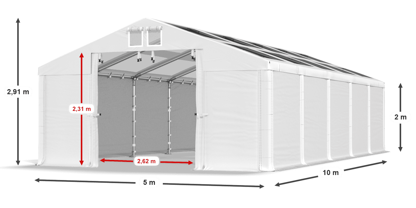 Poszycie posiada pełne ściany boczne i transparentny dach. Dzięki temu wnętrze namiotu magazynowego jest w pełni doświetlone, a jednocześnie niewidoczne dla osób postronnych. Plandeka wykonana jest z mocnego PVC, które jest odporne na wilgoć i promieniowanie UV. To doskonały namiot garażowy na pojazdy, sprzęt sportowy i meble ogrodowe. Pod zadaszeniem można przeprowadzać prace związane z montażem, segregacją lub produkcją. Poszycie zostało wyposażone w system łatwej zmiany długości Multi-size.