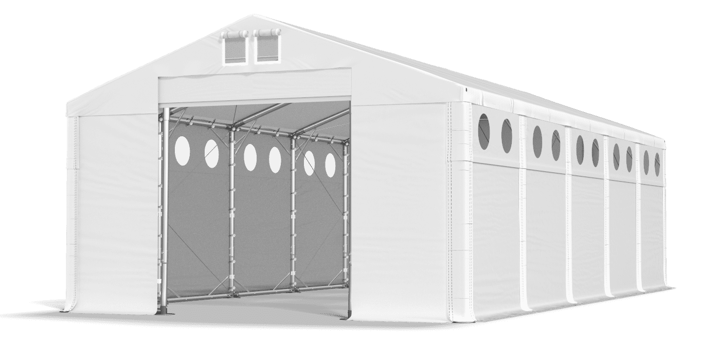 Poszycie z oknami doświetlającymi gwarantuje dopływ dziennego światła do wnętrza namiotu magazynowego. Plandeka z solidnego PVC jest odporna na wilgoć i promieniowanie UV. Pod zadaszeniem można magazynować towary, przeprowadzać naprawy, wykonywać prace związane z produkcją i segregacją. Poszycie zostało wyposażone w system łatwej zmiany długości Multi-size. Małe, okrągłe okna umieszczone są w górnej części ścian bocznych, dlatego wnętrze namiotu garażowego nie jest widoczne dla osób postronnych.