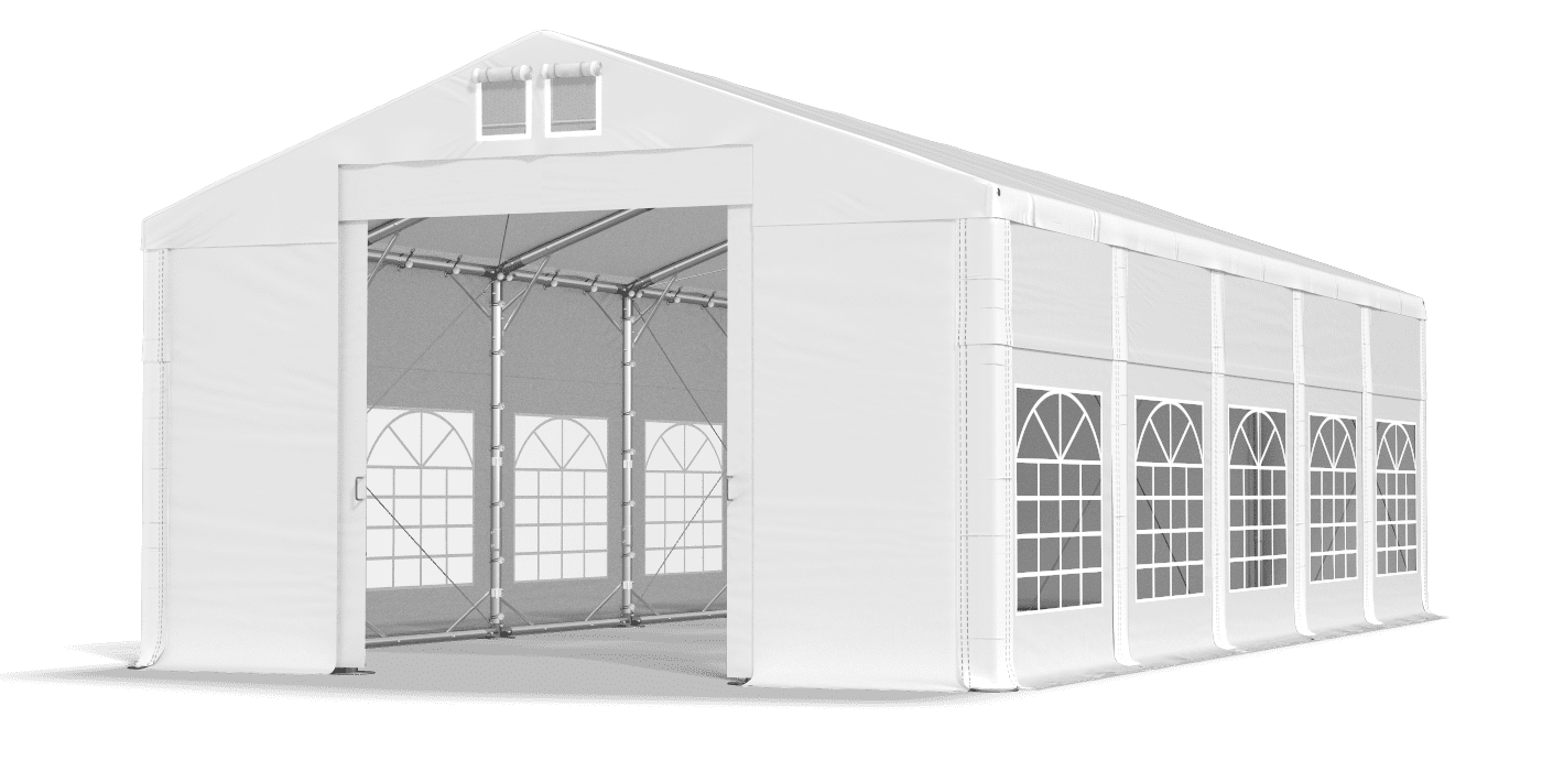 Mocna plandeka wykonana jest z PVC o wysokiej gramaturze. Posiada estetyczne okna witrażowe, które dostarczają dużo dziennego światła. Eleganckie poszycie wykorzystywane jest w namiotach imprezowych, namiotach gastronomicznych i w namiotach handlowych. Wodoodporna i odporna na promieniowanie UV plandeka chroni stoły i bufety, zapewniając suchą i zacienioną przestrzeń dla gości. Namiot z oknami witrażowymi to także doskonała altana ogrodowa.