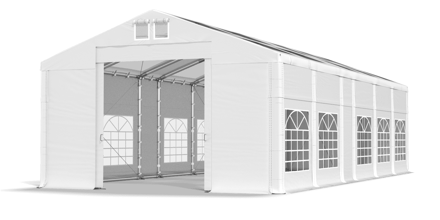 Poszycie z oknami witrażowymi wygląda elegancko i świetnie sprawdzi się podczas organizacji rodzinnych i biznesowych przyjęć plenerowych. Transparentny dach gwarantuje pełne doświetlenie stołów i bufetów. Plandeka jest w pełni odporna na wilgoć i promieniowanie UV. Dzięki temu wnętrze namiotu imprezowego pozostaje suche. Poszycie zostało wyposażone w system łatwej zmiany długości Multi-size. To także doskonały namiot ogrodowy i namiot wystawowy.