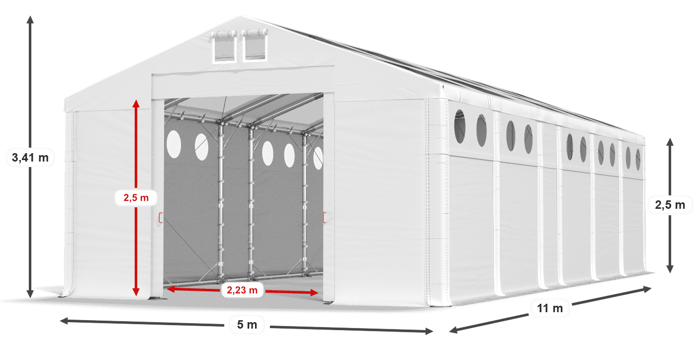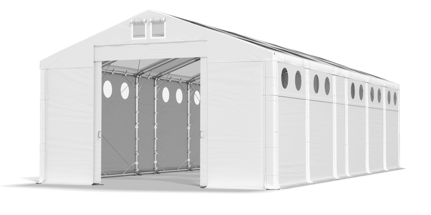 Plandeka wyposażona jest w małe okna doświetlające oraz transparentny dach. Dzięki temu wnętrze namiotu magazynowego jest dobrze doświetlone, a jednocześnie niewidoczne dla osób z zewnątrz. Poszycie wykonane jest z trwałego PVC, odpornego na wilgoć i promieniowanie UV. Szczelny namiot garażowy umożliwia przechowywanie towarów handlowych, sprzętu sportowego i pojazdów. Pod zadaszeniem można przeprowadzać prace związane z montażem, produkcją i segregacją. Poszycie zostało wyposażone w system łatwej zmiany długości Multi-size.