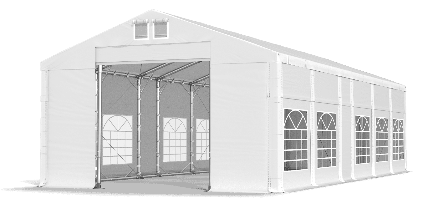 Trwała plandeka z oknami witrażowymi, chroni stoły i bufety przed wilgocią, wiatrem i promieniowaniem UV. Poszycie zbudowane jest z mocnego PVC. Eleganckie okna witrażowe są ozdobą namiotu imprezowego, a dodatkowo zapewniają dużo naturalnego światła. Trudnopalne poszycie zwiększa bezpieczeństwo podczas używania namiotu w celach gastronomicznych i cateringowych. Plandeka posiada system szybkiej zmiany długości Multi-size.