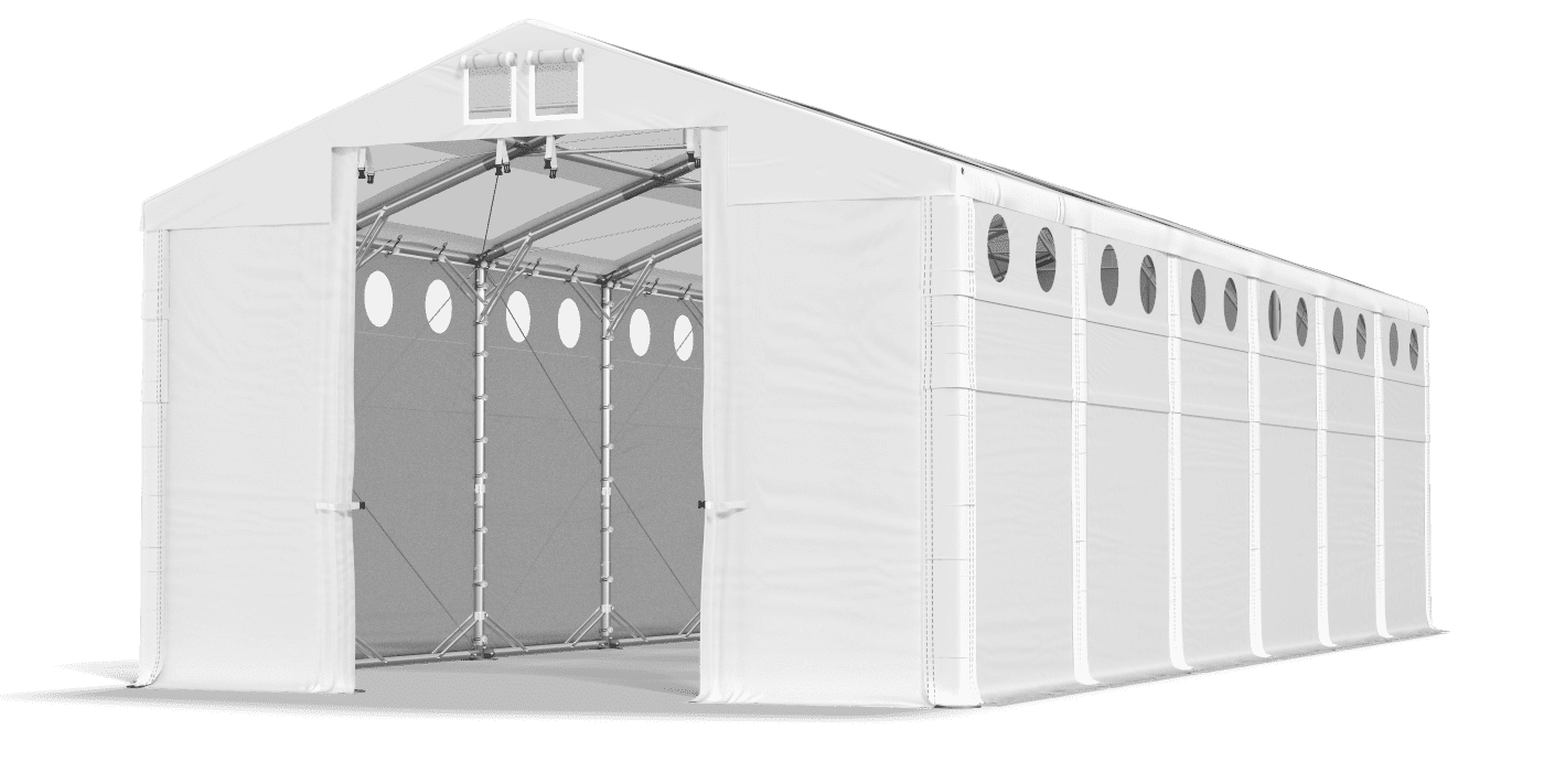 Poszycie jest wyposażone w transparentny dach i małe okna doświetlające. Okrągłe okna znajdują się w górnej części ścian bocznych namiotu garażowego. Dzięki temu do wnętrza dostaje się dużo dziennego światła, ale zawartość zadaszenia jest niewidoczna dla osób postronnych. Poszycie jest wykonane z PVC o wysokiej gramaturze. Jest odporne na promieniowanie UV i wilgoć, dlatego w namiocie magazynowym możemy przechowywać pojazdy, sprzęt sportowy, meble i towary handlowe. Poszycie zostało wyposażone w system łatwej zmiany długości Multi-size.