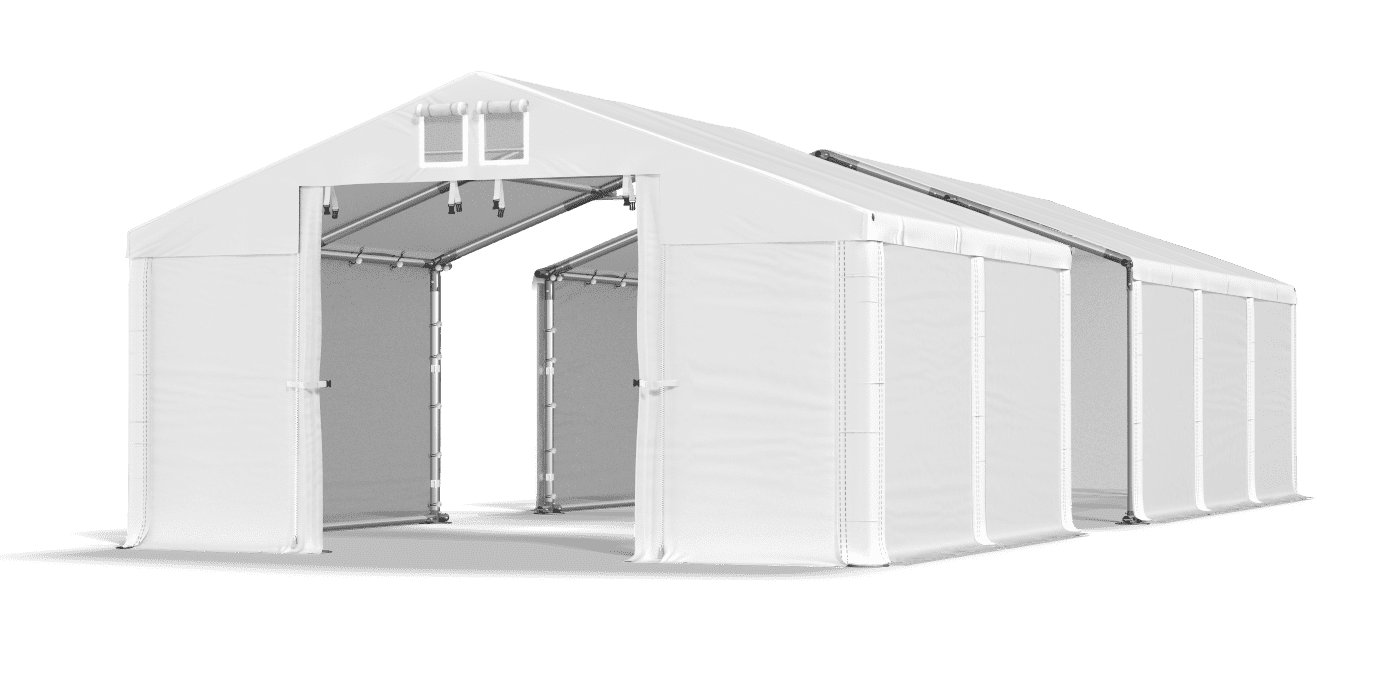 Mocna, pełna plandeka z PVC chroni zawartość namiotu przed zanieczyszczeniami oraz wpływem wilgoci i promieniowania UV. Szczelne poszycie namiotu magazynowego umożliwia przechowywanie towarów, garażowanie pojazdów. Szeroki fartuch retencyjny usprawnia odprowadzanie wody podczas opadów, a podwójne wywietrzniki regulują wymianę powietrza. Plandeka nie posiada okien, co uniemożliwia wgląd do namiotu z zewnątrz.