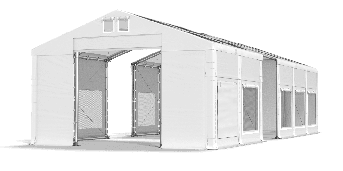 Plandeka wyposażona w okna z moskitierami jest niezwykle przewiewna, a jednocześnie chroni stoły i bufety przed latającymi owadami. Transparentny dach gwarantuje pełne doświetlenie wnętrza namiotu imprezowego. Poszycie wykonano z trwałego PVC o wysokiej gramaturze. Jest wodoodporne, szczelne i odporne na promieniowanie UV. Dzięki temu w namiocie eventowym można organizować plenerowe przyjęcia, pikniki rodzinne i firmowe eventy. Poszycie zostało wyposażone w system łatwej zmiany długości Multi-size.