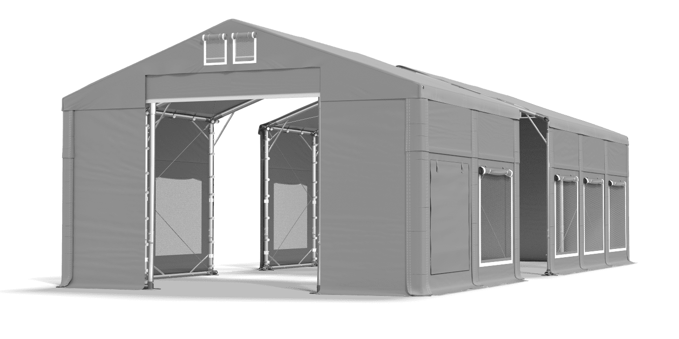 W dolnej części konstrukcji namiotu, na wjazdach zostały usunięte rury, co pozwala na swobodny wjazd i wyjazd pojazdu. Zamiast tego, zostały dodane pionowe rury usztywniające namiot.