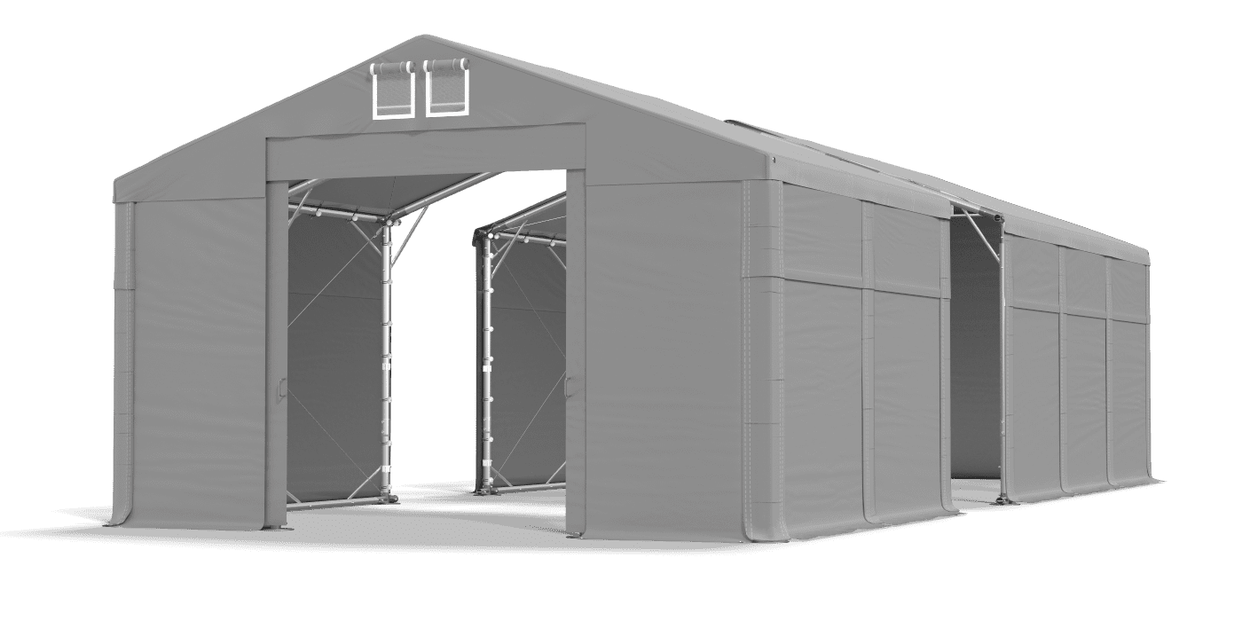Trwała, trudnopalna plandeka z PVC zapewnia bezpieczne warunki do przechowywania materiałów budowalnych, towarów handlowych, pojazdów i maszyn rolniczych. Pełne poszycie bez okien jest wyjątkowo szczelne, wodoodporne i nie przepuszcza dziennego światła. Wnętrze namiotu magazynowego jest niewidoczne dla osób postronnych. To doskonały namiot garażowy i hala przemysłowa. Plandeka posiada system szybkiej zmiany długości Multi-size.