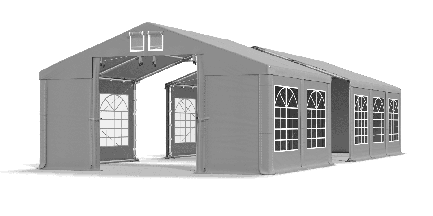 Mocne poszycie z oknami witrażowymi chroni stoły i bufety przed wilgocią i wiatrem. Szczelna plandeka z PVC jest odporna na promieniowanie UV, dlatego zapewnia suchą i zacienioną przestrzeń. W namiocie imprezowym możemy zorganizować rodzinne przyjęcia, festyny gminne i bankiety firmowe. To także doskonały namiot ogrodowy i namiot handlowy. Elegancka plandeka została wyposażona w system łatwej zmiany długości Multi-size.