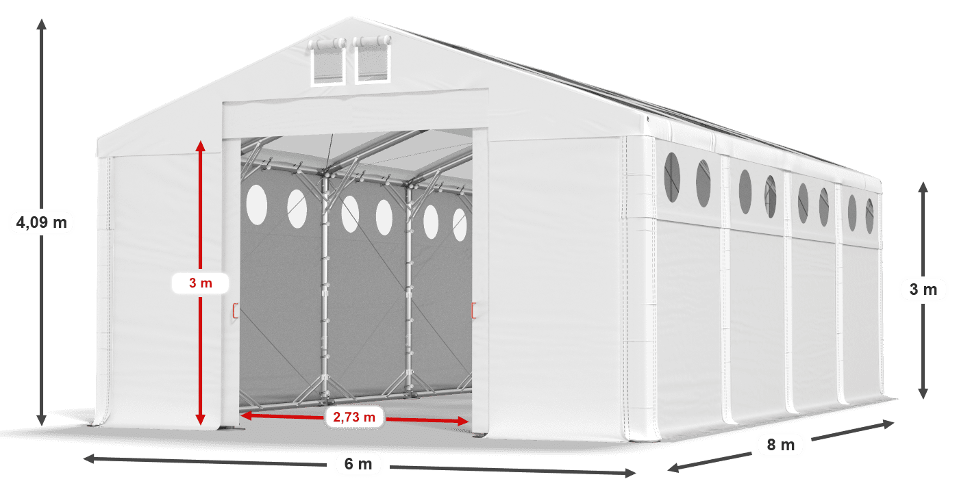 Plandeka z transparentnym dachem i oknami doświetlającymi zapewnia komfortowe warunki pracy w namiocie magazynowym. Poszycie jest wykonane z mocnego PVC, który chroni przechowywane towary przed wilgocią, promieniowaniem UV i zanieczyszczeniami. Transparentny dach i okrągłe okna w ścianach bocznych zapewniają optymalne doświetlenie. Plandeka została wyposażona w system łatwej zmiany długości Multi-size.