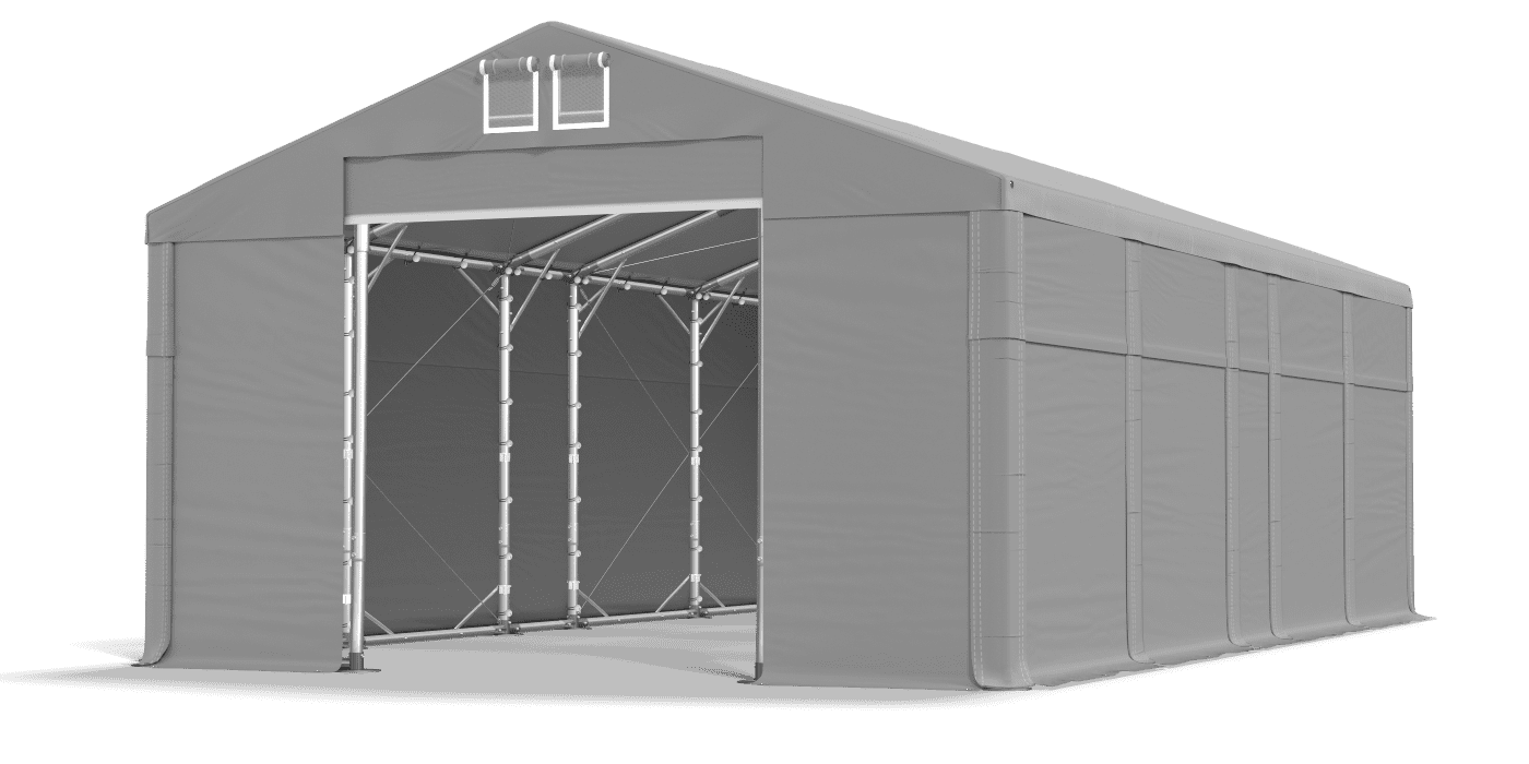 Trwała, trudnopalna plandeka z PVC zapewnia bezpieczne warunki do przechowywania materiałów budowalnych, towarów handlowych, pojazdów i maszyn rolniczych. Pełne poszycie bez okien jest wyjątkowo szczelne, wodoodporne i nie przepuszcza dziennego światła. Wnętrze namiotu magazynowego jest niewidoczne dla osób postronnych. To doskonały namiot garażowy i hala przemysłowa. Plandeka posiada system szybkiej zmiany długości Multi-size.