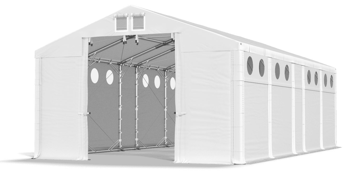Mocne poszycie z oknami doświetlającymi umożliwia garażowanie pojazdów, magazynowanie towarów i wykonywanie prac związanych z montażem. Trudnopalna plandeka wykonana z PVC jest wodoodporna, szczelna i odporna na promieniowanie UV. W suchym i zacienionym namiocie magazynowym możemy przechowywać plony, materiały budowlane i surowce. Okrągłe okna doświetlające zapewniają naturalne światło. Plandeka posiada system szybkiej zmiany długości Multi-size.