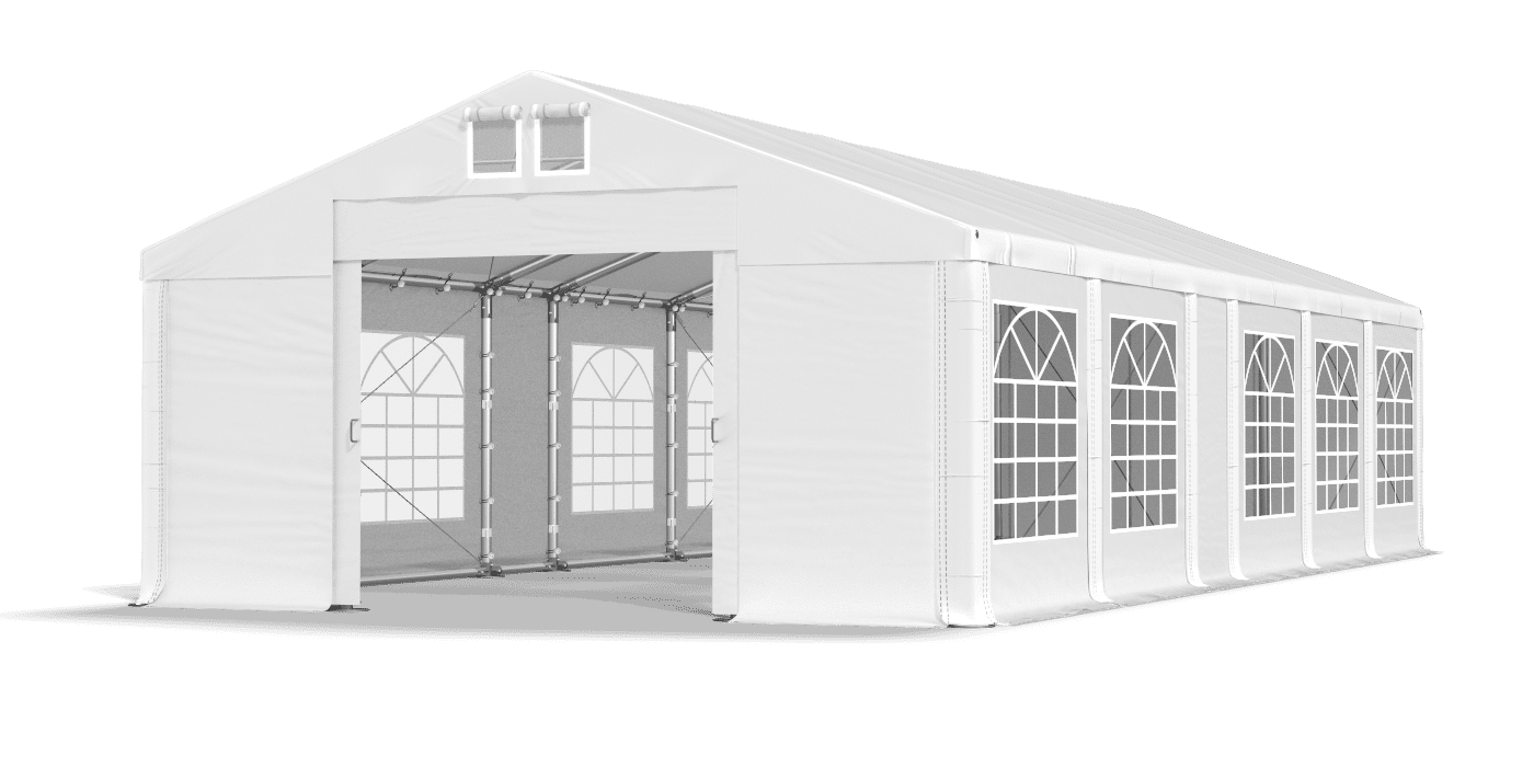Trwała plandeka z oknami witrażowymi, chroni stoły i bufety przed wilgocią, wiatrem i promieniowaniem UV. Poszycie zbudowane jest z mocnego PVC. Eleganckie okna witrażowe są ozdobą namiotu imprezowego, a dodatkowo zapewniają dużo naturalnego światła. Trudnopalne poszycie zwiększa bezpieczeństwo podczas używania namiotu w celach gastronomicznych i cateringowych. Plandeka posiada system szybkiej zmiany długości Multi-size.