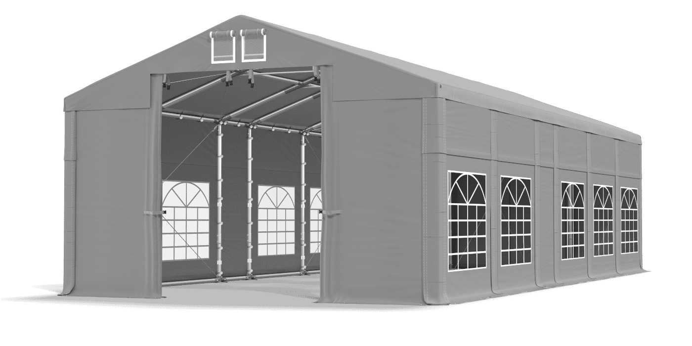 Mocne poszycie z oknami witrażowymi chroni stoły i bufety przed wilgocią i wiatrem. Szczelna plandeka z PVC jest odporna na promieniowanie UV, dlatego zapewnia suchą i zacienioną przestrzeń. W namiocie imprezowym możemy zorganizować rodzinne przyjęcia, festyny gminne i bankiety firmowe. To także doskonały namiot ogrodowy i namiot handlowy. Elegancka plandeka została wyposażona w system łatwej zmiany długości Multi-size.