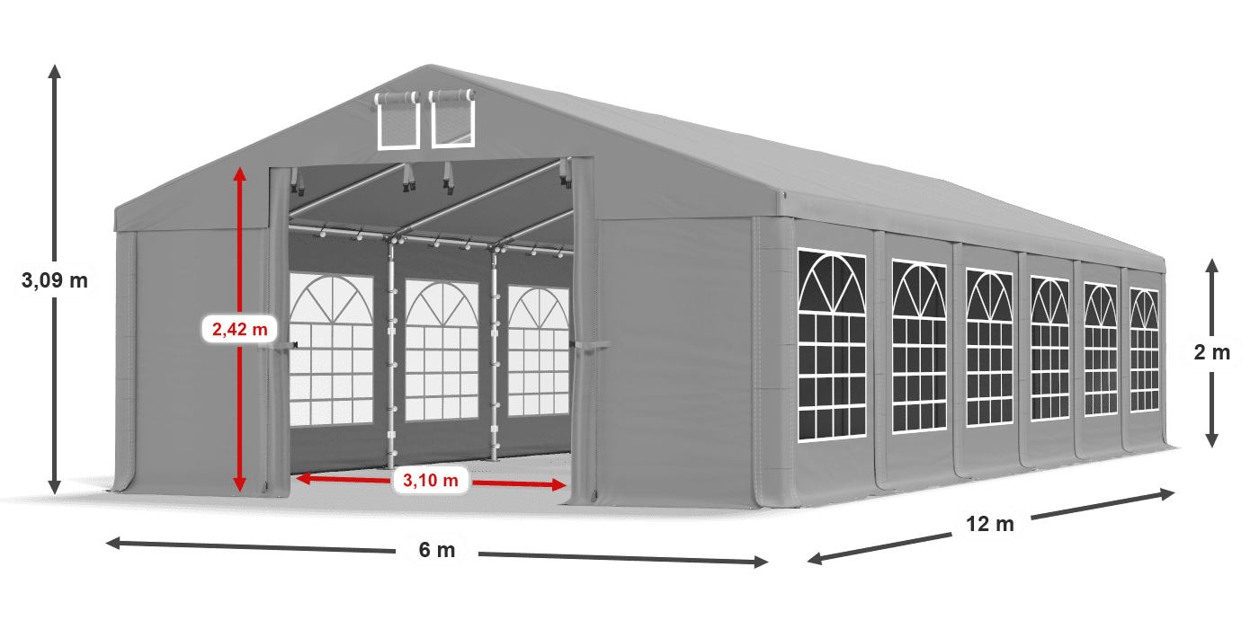 Ściana boczna zbudowana jest z grubej plandeki PVC ok. 500 g/m2 oraz dużych okien witrażowych. Wysokość podstawowej ścianki to 2m. Dzięki unikalnemu projektowi, istnieje możliwość łatwego podniesienia ściany bocznej o 0,5m lub 1m. Dzięki oknom umieszczonym na każdym dwumetrowym segmencie, namiot wygląda estetycznie. Nadaje się on świetnie jako namiot handlowy, wystawowy lub imprezowy.