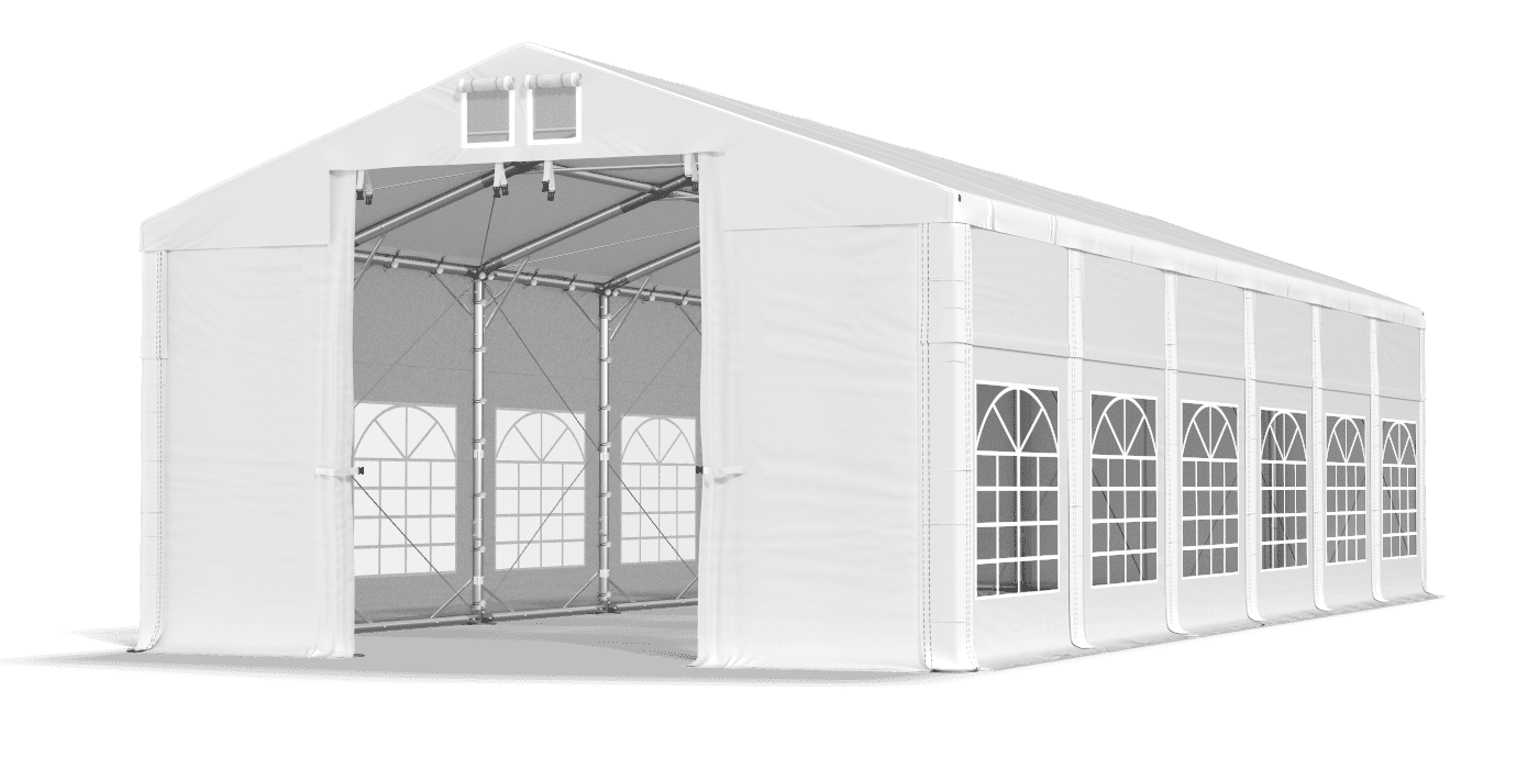 Mocna plandeka wykonana jest z PVC o wysokiej gramaturze. Posiada estetyczne okna witrażowe, które dostarczają dużo dziennego światła. Eleganckie poszycie wykorzystywane jest w namiotach imprezowych, namiotach gastronomicznych i w namiotach handlowych. Wodoodporna i odporna na promieniowanie UV plandeka chroni stoły i bufety, zapewniając suchą i zacienioną przestrzeń dla gości. Namiot z oknami witrażowymi to także doskonała altana ogrodowa.