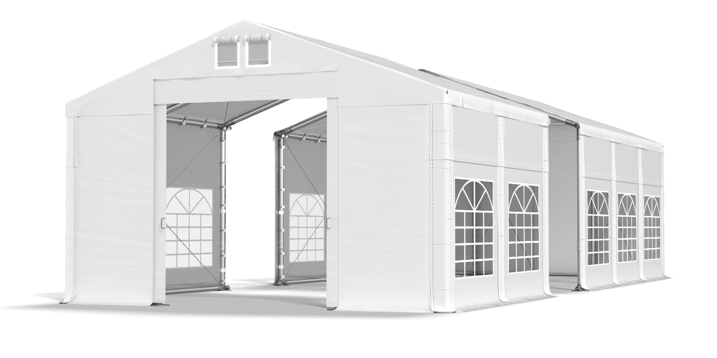Trwała plandeka z oknami witrażowymi, chroni stoły i bufety przed wilgocią, wiatrem i promieniowaniem UV. Poszycie zbudowane jest z mocnego PVC. Eleganckie okna witrażowe są ozdobą namiotu imprezowego, a dodatkowo zapewniają dużo naturalnego światła. Trudnopalne poszycie zwiększa bezpieczeństwo podczas używania namiotu w celach gastronomicznych i cateringowych. Plandeka posiada system szybkiej zmiany długości Multi-size.