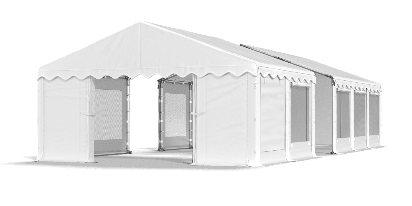 Przewiewna plandeka PE została wyposażona w duże okna z moskitierami. Zadaszenie doskonale sprawdzi się w okresie letnim, ponieważ zapewni przepływ świeżego powietrza, a jednocześnie ochroni stoły i bufety przed latającymi owadami. Okna posiadają rozwijane rolety, którymi możemy uszczelnić moskitiery w razie ochłodzenia. Namiot z moskitierami możemy wykorzystać podczas organizacji imprez plenerowych, rodzinnych pikników i biznesowych przyjęć.