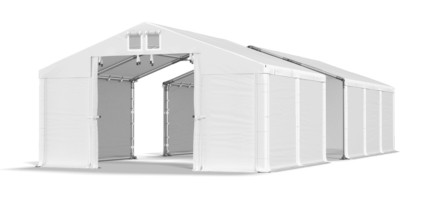 Pełna plandeka z mocnego PVC zapewnia suchą i zacienioną przestrzeń do składowania towarów, przechowywania plonów i garażowania pojazdów. Poszycie jest odporne na warunki atmosferyczne i niezwykle szczelne. W namiocie warsztatowym można przeprowadzać również prace związane z montażem, segregacją i produkcją. Plandeka bez okien chroni zawartość namiotu magazynowego przed wzrokiem osób postronnych.