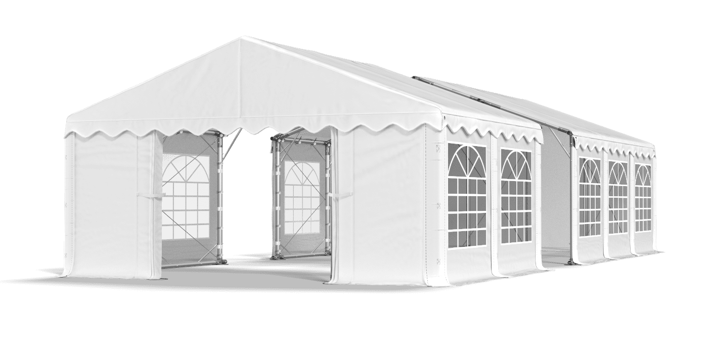 Eleganckie poszycie wyposażone w duże, witrażowe okna doskonale sprawdzi się podczas organizacji rodzinnych przyjęć, imprez firmowych, festynów i gminnych eventów. Plandeka z wodoodpornego PE może być wykorzystywana w okresie wiosenno-letnim. Zadaszenie zapewnia suchą i zacienioną przestrzeń na stoły i bufety. Namiot witrażowy sprawdzi się jako komfortowa altana ogrodowa lub mobilne stoisko handlowe. To także doskonały namiot cateringowy.